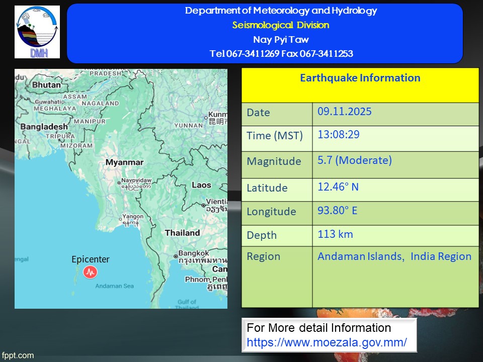 A moderate earthquake of magnitude (5.7) Richter Scale with its epicenter outside Myanmar (Andaman Islands, India Region), latitude 12.46°N, longitude 93.80°E, depth (113) kilometers, about (340) miles southwest of Kaba-Aye seismological observatory was recorded at (13)hr (08)min (29)sec M.S.T on 9th November, 2025.