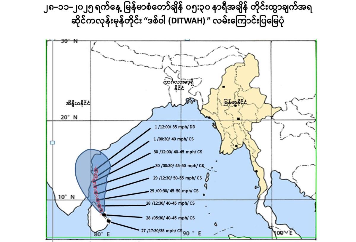 People should be awared due to the Cyclonic Storm “DITWAH” domestic aviation, near-shore and offshore fishing vessels, and ships Gulf of Mottama, off and along Mon-Taninthayi coast and offshore are also advised to take precautions.