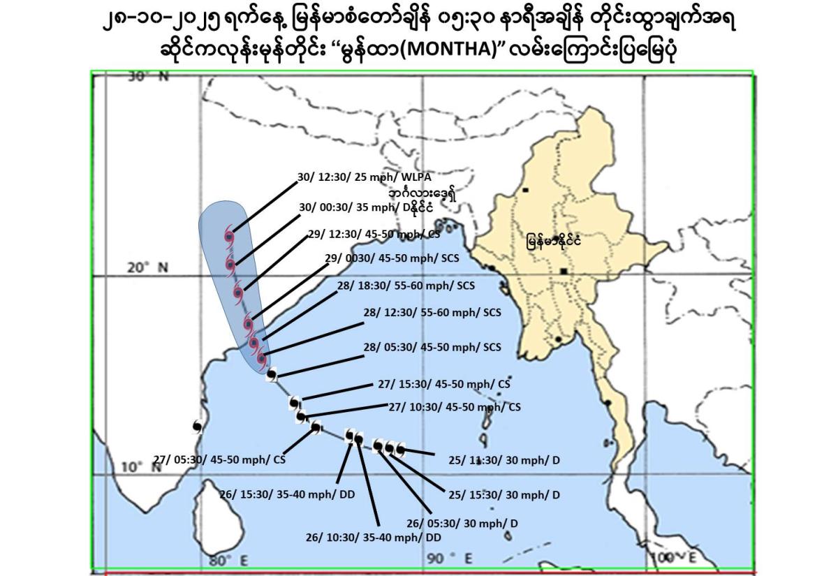 Due to the Cyclonic Storm, rain or thundershowers will be scattered to fairly widespread in Yangon, Bago, Ayeyarwady, Taninthayi Regions and Kayin, Mon, Rakhine States and isolated in Naypyitaw, Mandalay, Magway, Sagaing Regions and Kachin, Kayah, Chin, Shan States from this morning to next 24 hours. Squalls with rough seas are likely at times in Deltaic, off and along Rakhine Coasts. Surface wind speed in squalls may reach 30-35 mph. Wave height will be about 9-11 feet in Deltaic, off and along Rakhine Coasts.