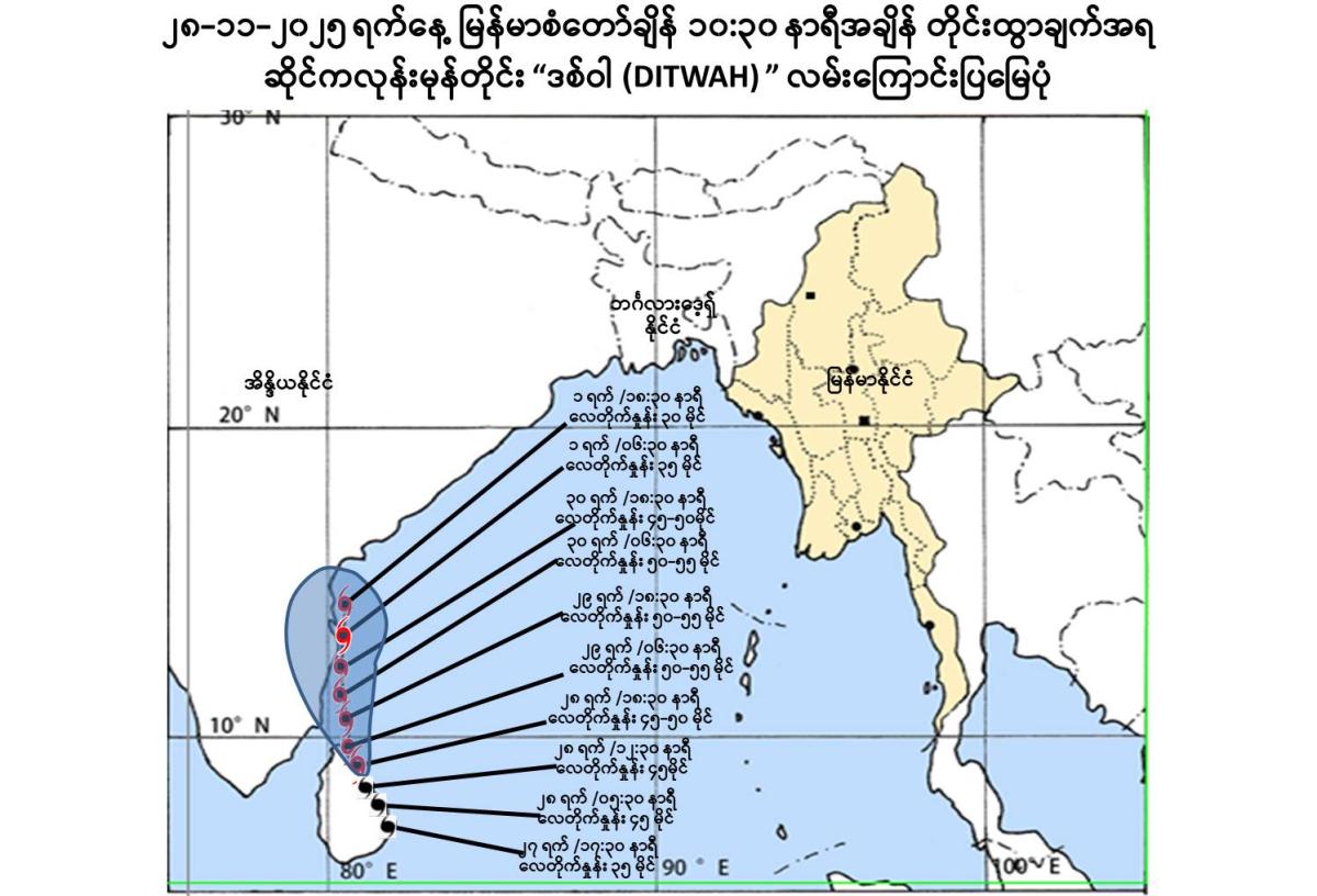 People should be awared due to the Cyclonic Storm “DITWAH” domestic aviation, near-shore and offshore fishing vessels, and ships Gulf of Mottama, off and along Mon-Taninthayi coast and offshore are also advised to take precautions.