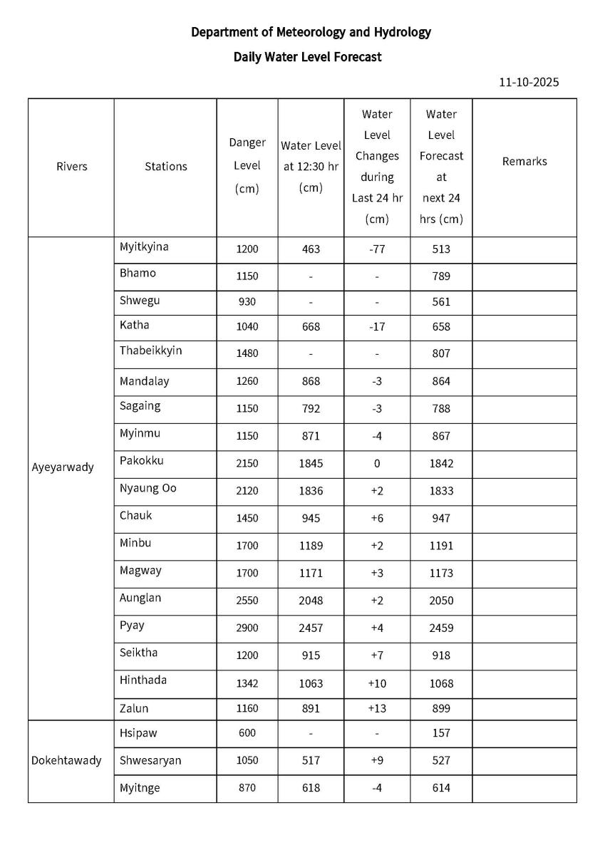 Daily Water Level Forecast (Issued at 14:00 hr MST on 11-10-2025)
