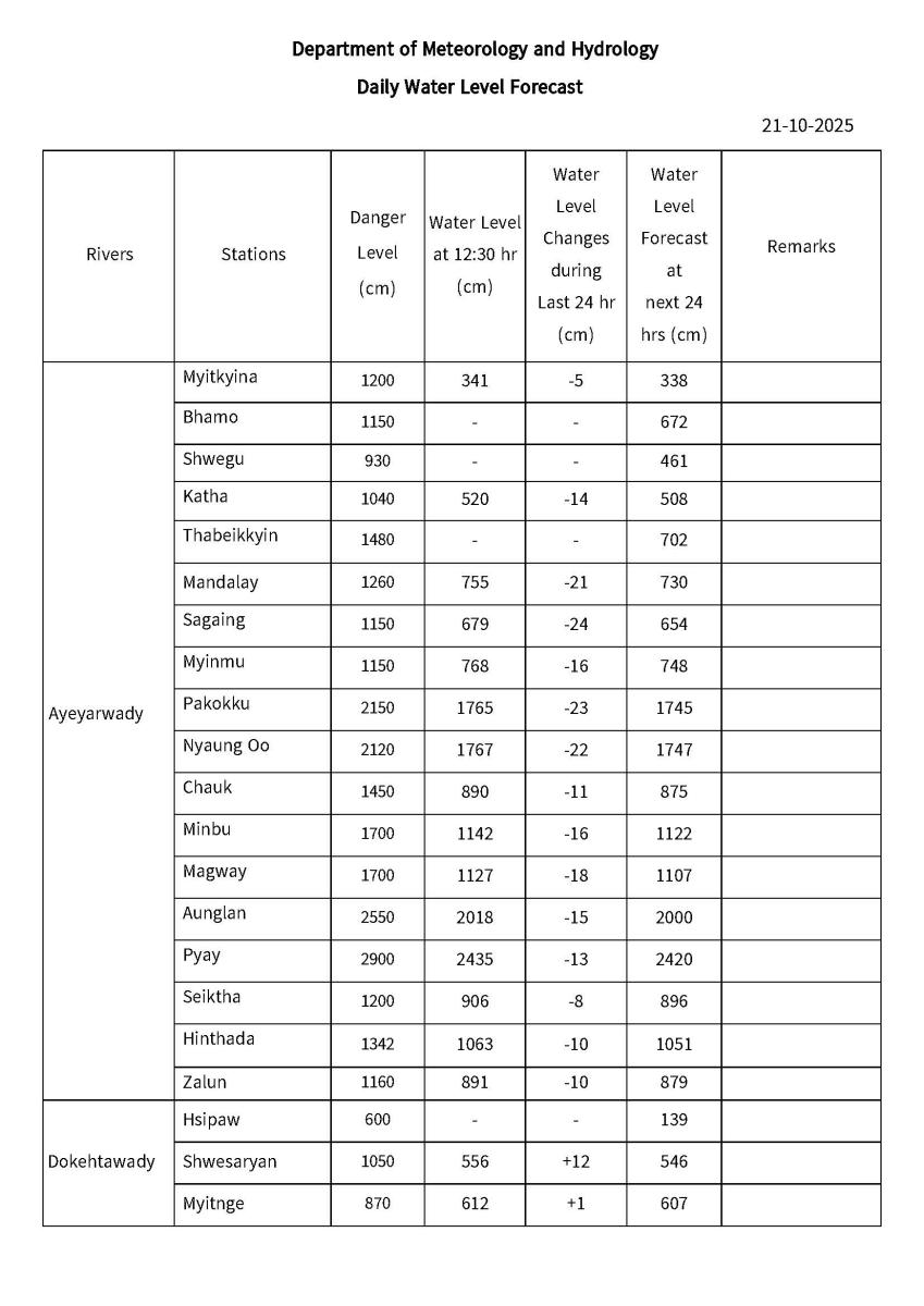 Daily Water Level Forecast (Issued at 14:00 hr MST on 21-10-2025)