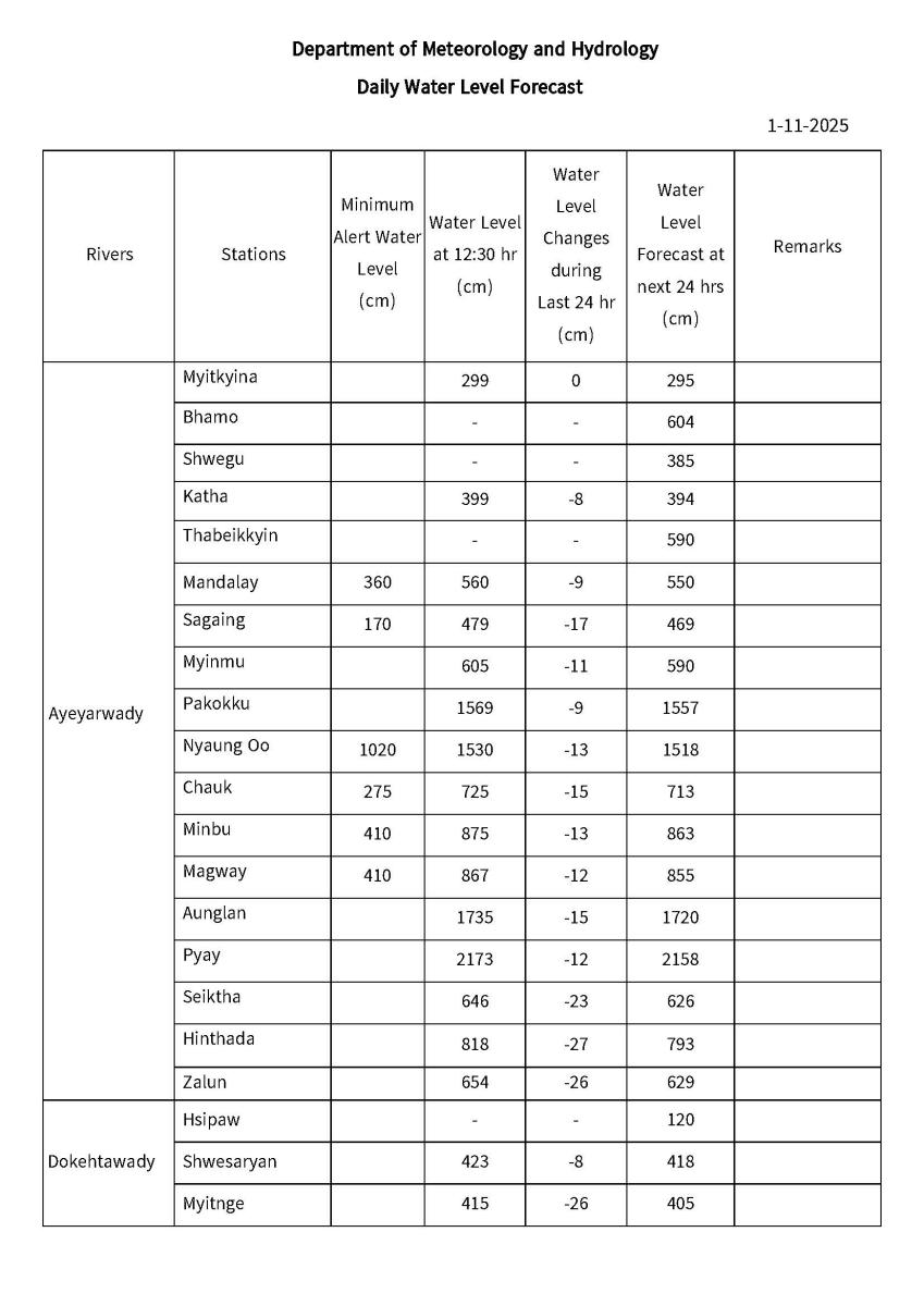 Daily Water Level Forecast (Issued at 14:00 hr MST on 1-11-2025)