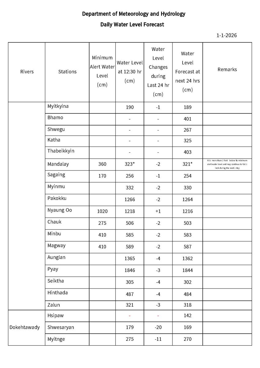 Thursday, January 1, 2026 - 13:15Department of Meteorology and Hydrology Daily Water Level Forecast (Issued at 14:00 hr MST on 1-1-2026) Daily Water Level Forecast for (31-12-2025) Daily Water Level Forecast for (30-12-2025) Daily Water Level Forecast for (29-12-2025)
