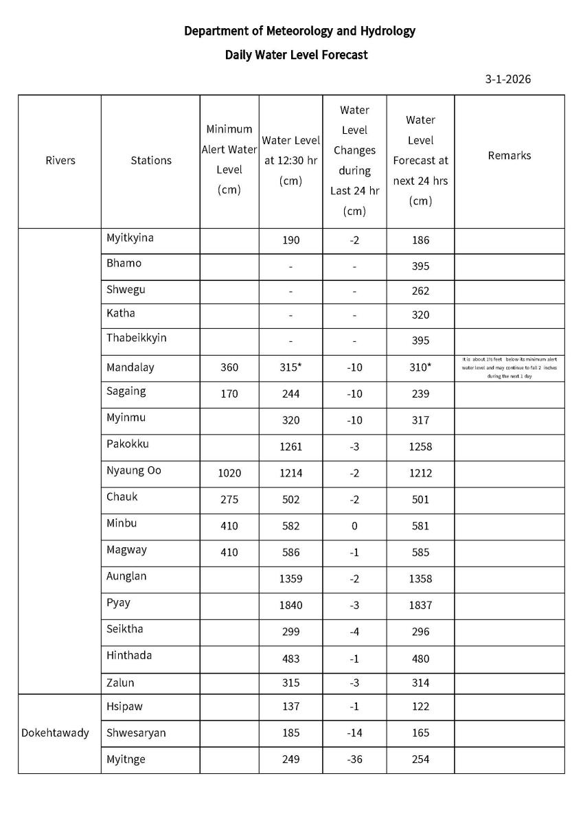 Saturday, January 3, 2026 - 14:00Department of Meteorology and Hydrology Daily Water Level Forecast (Issued at 14:00 hr MST on 3-1-2026) Daily Water Level Forecast for (2-1-2026) Daily Water Level Forecast for (1-1-2026) Daily Water Level Forecast for (31-12-2025)