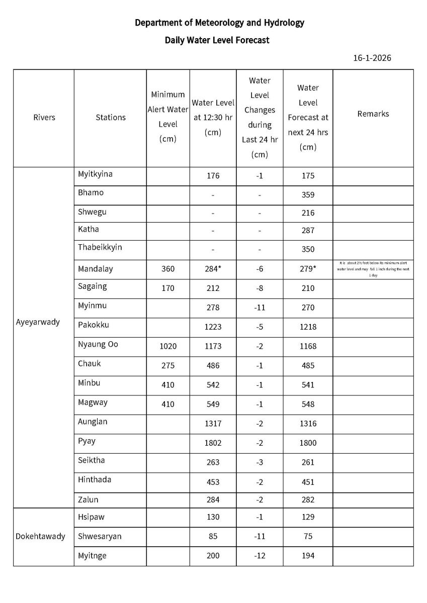 Daily Water Level Forecast (Issued at 14:00 hr MST on 16-1-2026)