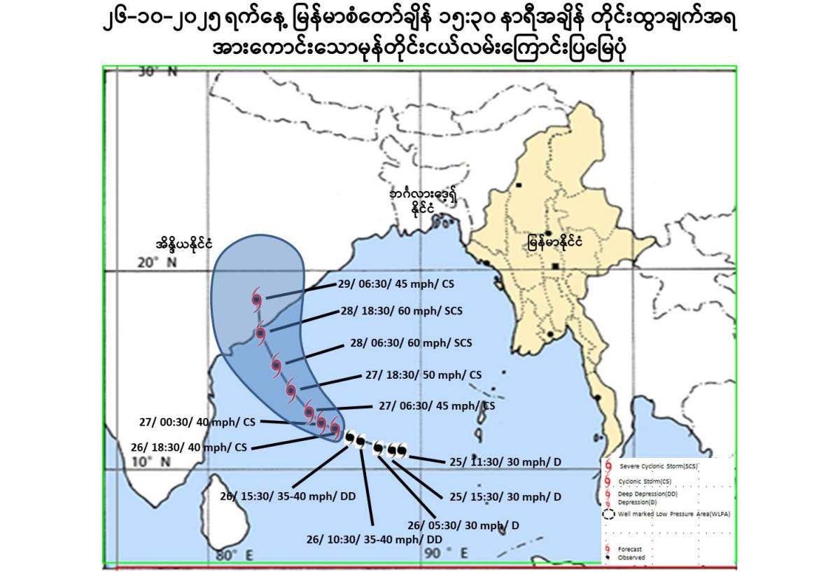 Due to the Deep Depression, rain or thundershowers will be scattered to fairly widespread in Yangon, Ayeyarwady, Taninthayi Regions, Chin, Mon and Rakhine States, isolated to scattered in Naypyitaw, Mandalay, Bago, Magway, Sagaing Regions and Kachin, Kayah, Kayin and Shan States from today evening to 28-8-2025. Squalls with moderate to rough seas are likely at times off and along Myanmar Coasts. Surface wind speed in squalls may reach 25-30 mph. Wave height will be about 7-9 feet in off and along Myanmar Coasts.