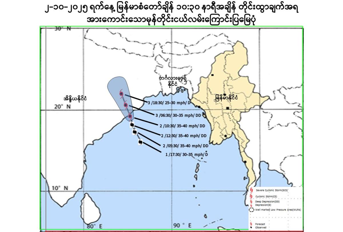 Due to the depression rain or thundershowers will be fairly widespread to widespread in Naypyitaw, Yangon, Mandalay, Bago, Magway, Sagaing, Ayeyarwady, Taninthayi Regions and Kachin, Kayah, Kayin, Chin, Mon, Rakhine, Shan States with isolated heavyfalls in some Regions and States from today morning to next 24 hours. Occassional squalls with rough sea will be experienced Deltaic, off and along Rakhine Coasts. Surface wind speed in squalls may reach 35 mph. Wave height will be about 10-12 feet in Deltaic, off and along Rakhine Coasts. Squalls with moderate to rough sea are likely at times in Gulf of Mottama, off and along Mon-Taninthayi Coasts. Surface wind speed in squalls may reach 25-30 mph. Wave height will be about 8-10 feet in Gulf of Mottama, off and along Mon-Taninthayi Coasts