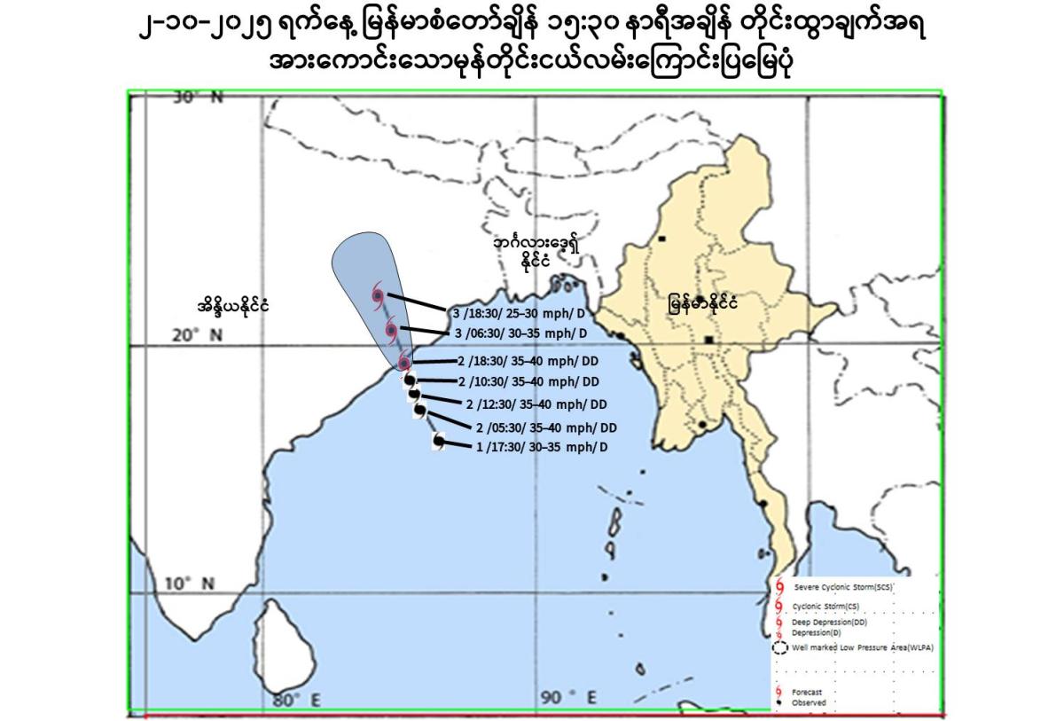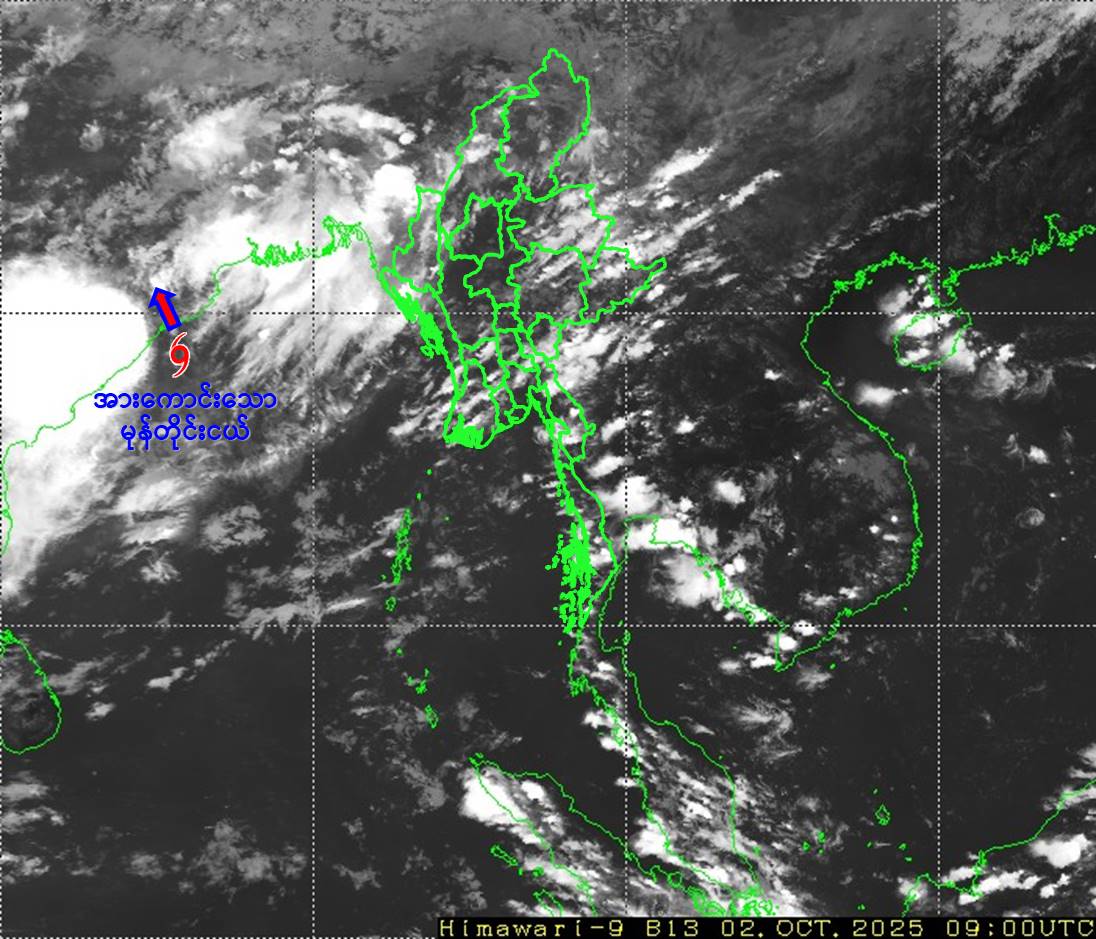 Due to the depression rain or thundershowers will be scattered Magway, Lower Sagaing Regions and Kayah, Chin States, fairly widespread in Naypyitaw, Mandalay, Bago, Taninthayi Regions and Kayin, Mon States and widespread in Yangon, Upper Sagaing, Ayeyarwady Regions and Kachin, Rakhine, Shan States with isolated heavyfalls in Upper Sagaing Region and Kachin, Rakhine States from today evening to next 24 hours. Squalls with rough sea are likely at times in Deltaic, off and along Rakhine Coasts. Surface wind speed in squalls may reach 30 mph. Wave height will be about 9-11 feet in Deltaic, off and along Rakhine Coasts. Squalls with moderate to rough sea are likely at times in Gulf of Mottama, off and along Mon-Taninthayi Coasts. Surface wind speed in squalls may reach 25-30 mph. Wave height will be about 8-10 feet in Gulf of Mottama, off and along Mon-Taninthayi Coasts