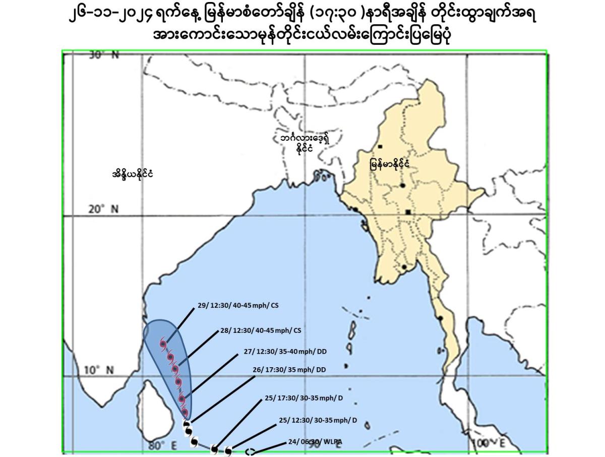 Due to the Deep Depression, rain are likely to be isolated to scatted in Naypyitaw, Sagaing, Mandalay, Magway, Bago Regions and Kachin, Shan, Chin, Rakhine, Kayah States from 28-11-2024 to 30-11-2024.