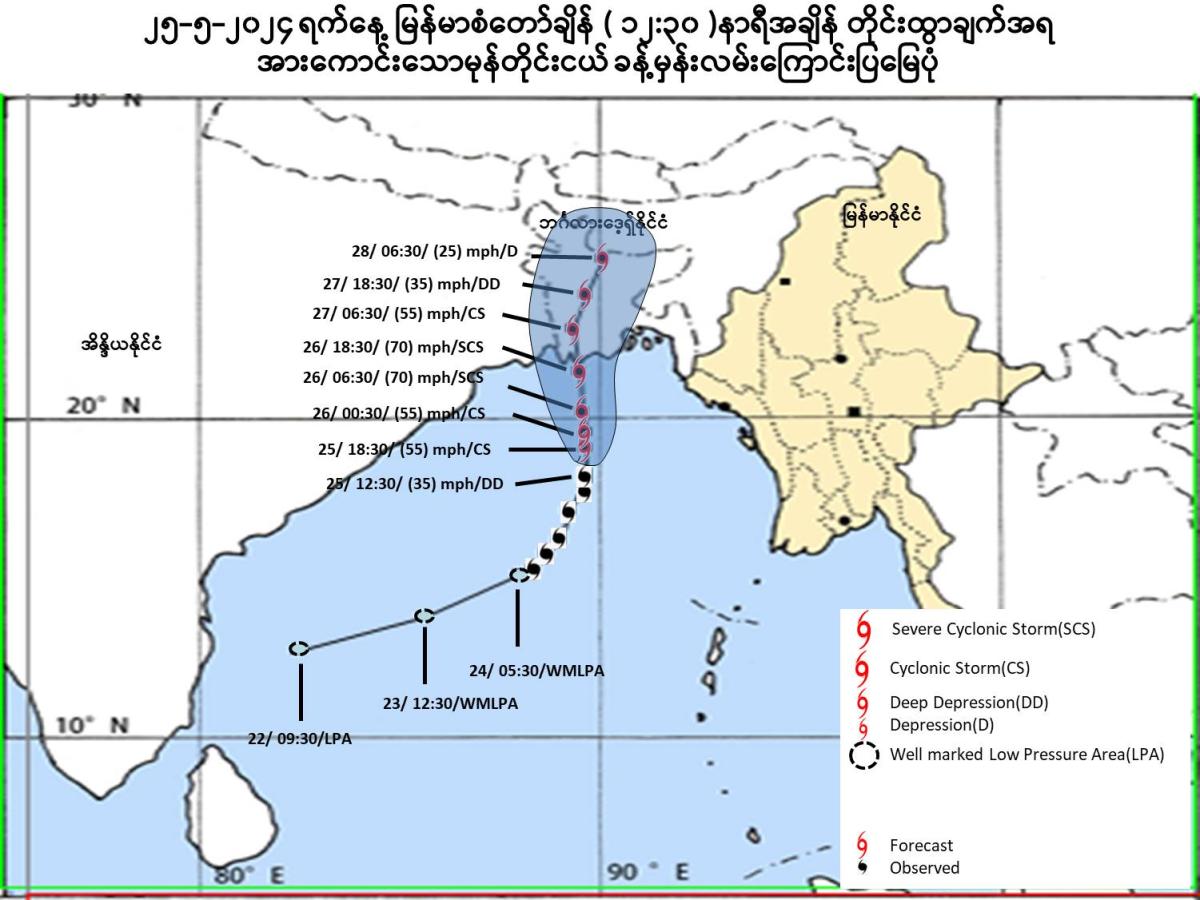 According to the observations at (12:30) hrs M.S.T today, the deep depression over Eastcentral Bay of Bengal has moved Northwards and centered at about (310) Nautical miles Northwest of Coco Island, (290) Nautical miles West-Northwest of Hainggyigyun, (265) Nautical miles West of Thandwe (Myanmar), (220) Nautical miles Southwest of Sittwe (Myanmar), (240) Nautical miles South-Southwest of Khepupara (Bangladesh), (240) Nautical miles South-Southeast of Sagar Island and (265) Nautical miles South-Southeast of Canning (West Bangal, India).