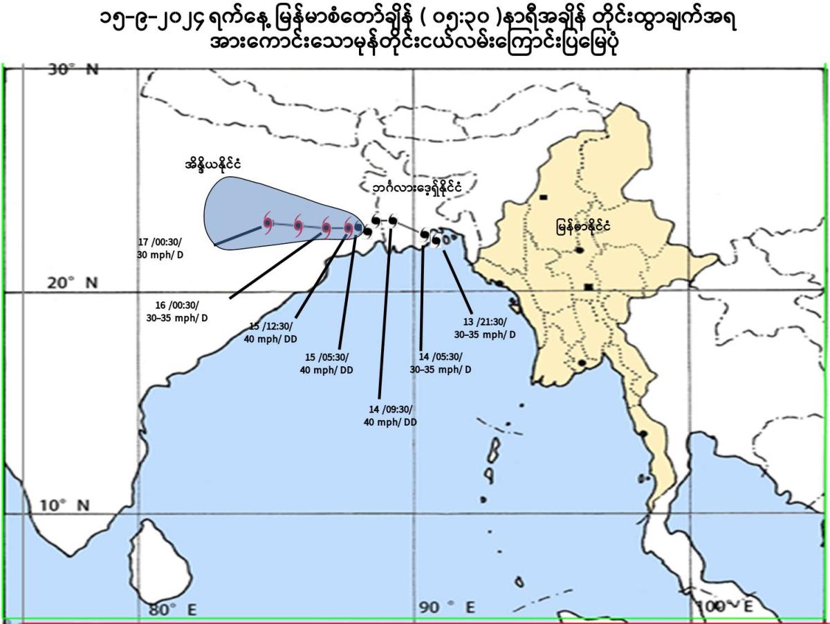 Under the influence of deep depression, people should be awared heavy rain with strong wind, flash flood and landslide in the hilly areas and near small rivers and also domestic flight, trawlers, vessels and ships in Deltaic, off and along Rakhine Coasts.