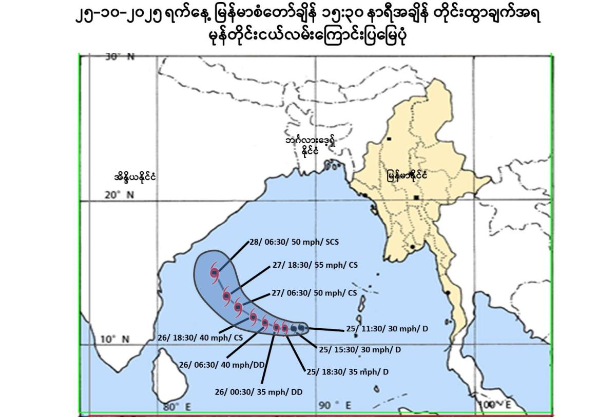 Due to the depression, rain or thundershowers will be scattered to fairly widespread in Taninthayi Region, Chin and Rakhine States, isolated to scattered in Naypyitaw, Yangon, Mandalay, Bago, Magway, Sagaing, Ayeyarwady Regions and Kachin, Kayah, Kayin, Mon and Shan States from today evening  to 27-8-2025. Squalls with moderate to rough seas are likely at times in Deltaic, Gulf of Mottama, off and along Mon-Taninthayi Coasts. Surface wind speed in squalls may reach 25-30 mph. Wave height will be about 7-9 feet in Deltaic, Gulf of Mottama, off and along Mon-Taninthayi Coasts. Sea will be slight to moderate elsewhere in Myanmar waters. Wave height will be about 4-6 feet in off and along Rakhine Coast.