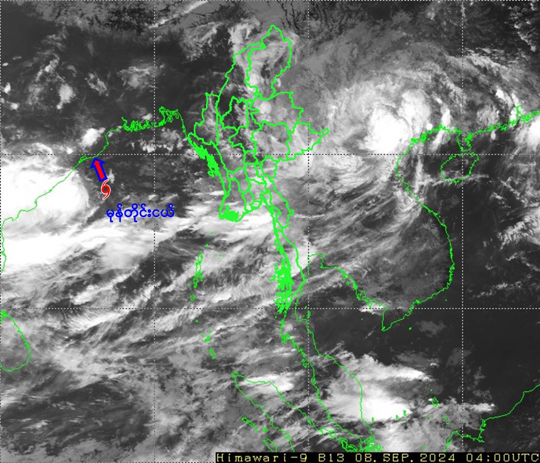 Under the influence of depression, rain or thundershowers will be fairly widespread to widespread in Naypyitaw, Sagaing, Magway, Bago, Yangon, Ayeyarwady Regions and Chin, Rakhine States with likelihood of regionally and isolated heavyfalls in some Regions and States along with strong winds from today Noon to 12-9-2024. Occassional squalls with rough seas will be experienced off and along Myanmar Coasts. Surface wind speed in squalls may reach 40 mph. Wave height will be about 9 - 12 feet off and along Myanmar Coasts.