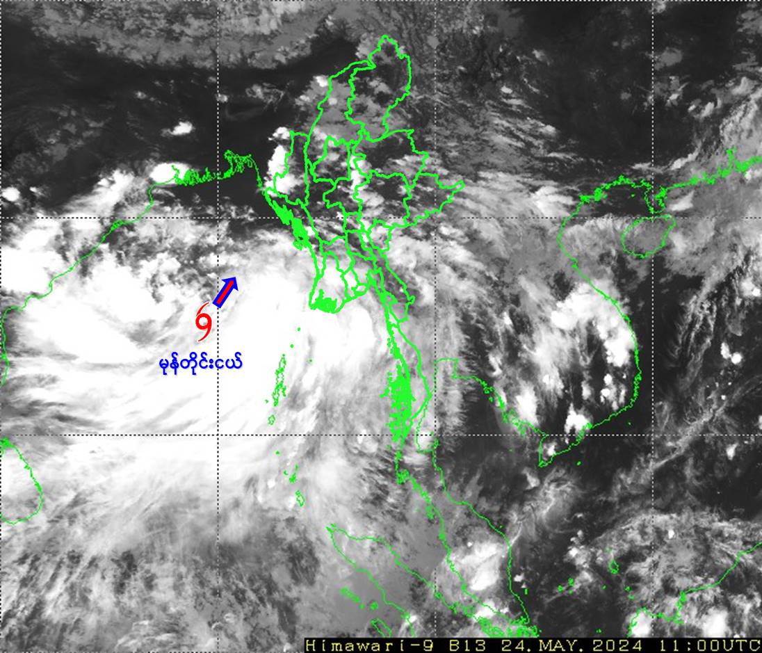Under the influence of depression, rain or thundershowers will be fairly widespread to widespread in Naypyitaw, Sagaing, Mandalay, Magway, Bago, Yangon, Ayeyarwady, Taninthayi Regions and Kachin, Chin, Rakhine, Kayin, Mon States with likelihood of regionally and isolated heavyfalls in some Regions and States along with strong winds from tonight  to 27-5-2024. Occasional squalls with rough seas will be experienced in Gulf of Mottama, off and along Mon-Taninthayi Coasts. Surface wind speed in squall may reach 40-45 mph and wave height will be about 9-12 feet from 24-5-2024 to 25-5-2024. Frequent squalls with rough to very rough seas will be experienced in Deltaic, off and along Rakhine Coasts. Surface wind speed in squall may reach 40-45 mph and wave height will be about 9-13 feet from 24-5-2024 and surface wind speed in squall may reach 50-60 mph and wave height will be about 13-16 feet from 25-5-2024 to 26-5-2024.