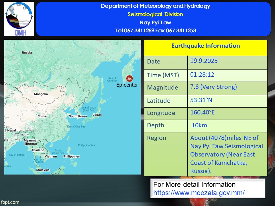 A very strong earthquake of magnitude (7.8) Richter Scale with its epicenter outside Myanmar (Near East Coast of Kamchatka, Russia), latitude 53.31°N, longitude 160.40°E, depth (10) kilometers, about (4078) miles northeast of Naypyitaw seismological observatory was recorded at (01)hr (28)min (12)sec M.S.T on 19th September, 2025.