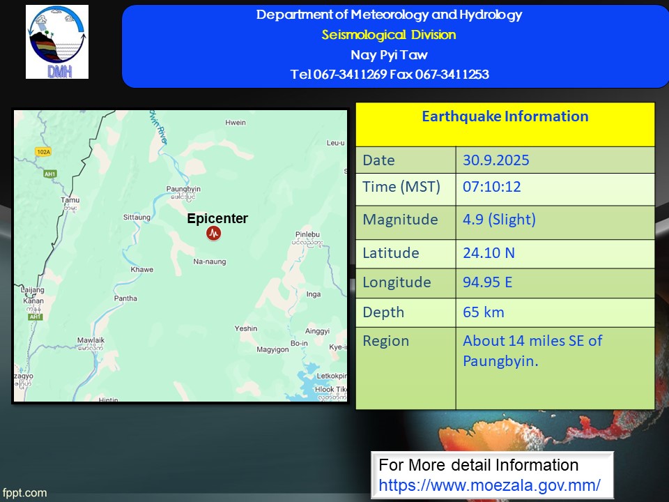 A slight earthquake of magnitude (4.9) Richter Scale with its epicenter inside Myanmar (about (14) miles southeast of Paungbyin), latitude 24.10 °N, longitude 94.95 °E, depth (65) kilometers, about (42) miles east-southeast of Tamu seismological observatory was recorded at (07) hr (10) min (12) sec M.S.T on 30th September, 2025.
