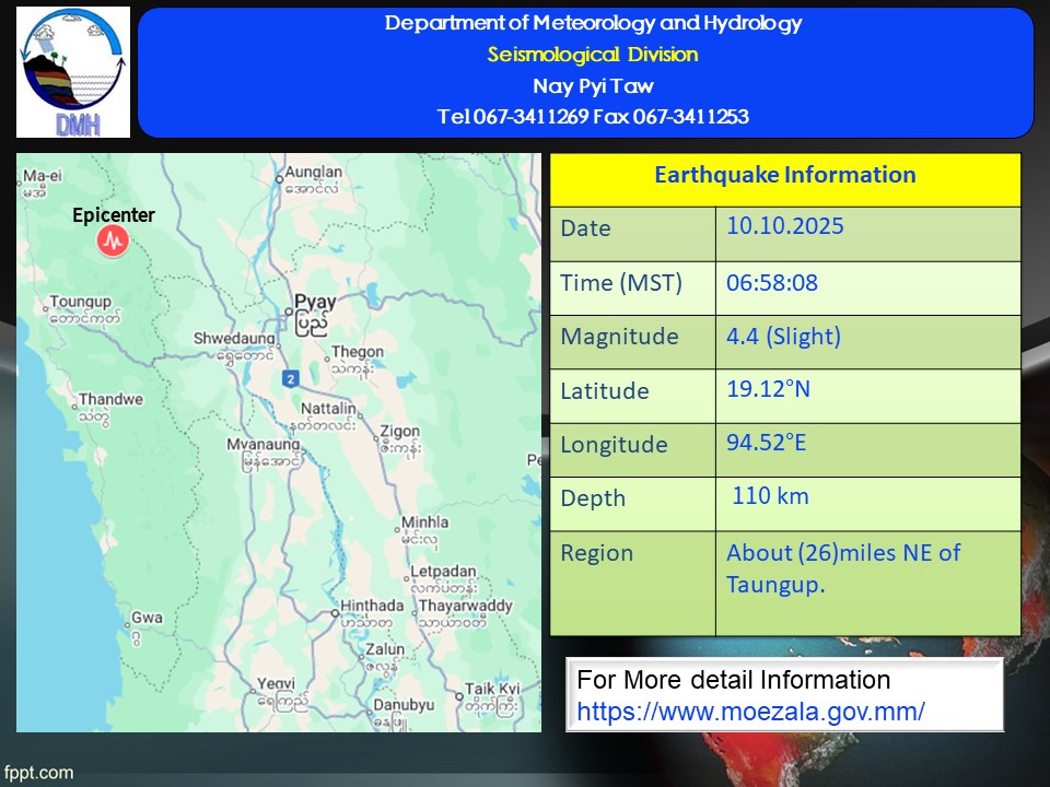 A slight earthquake of magnitude (4.4) Richter Scale with its epicenter inside Myanmar (about (26) miles northeast of Taungup), latitude 19.12°N, longitude 94.52°E, depth (110) kilometers, about (105) miles north of Gwa seismological observatory was recorded at (06) hr (58) min (08) sec M.S.T on 10th October, 2025.