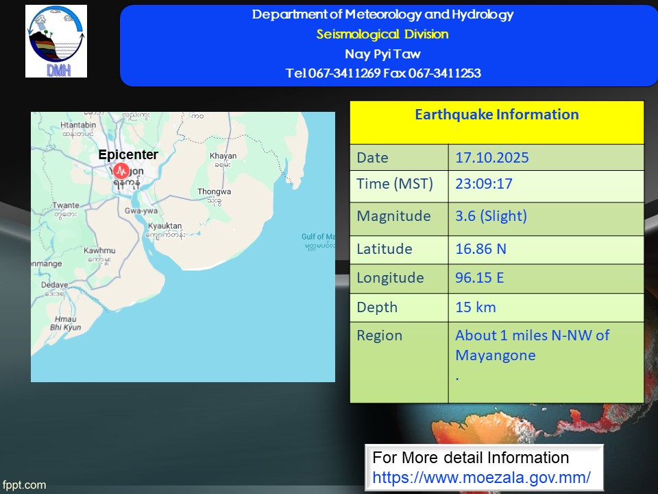 A slight earthquake of magnitude (3.6) Richter Scale with its epicenter inside Myanmar (about (1) miles north-northwest of Mayangone), latitude 16.86 °N, longitude 96.15 °E, depth (15) kilometers, about (1) miles west-southwest of Kaba-Aye seismological observatory was recorded at (23) hr (09) min (17) sec M.S.T on 17th October, 2025.
