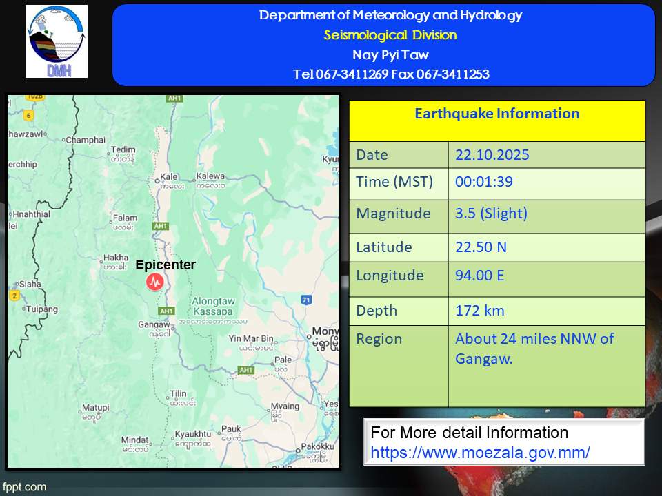 A slight earthquake of magnitude (3.5) Richter Scale with its epicenter inside Myanmar (about (24) miles north-northwest of Gangaw), latitude 22.50 °N, longitude 94.00 °E, depth (172) kilometers, about (27) miles east-southeast of Hakha seismological observatory was recorded at (00) hr (01) min (39) sec M.S.T on 22nd October, 2025.