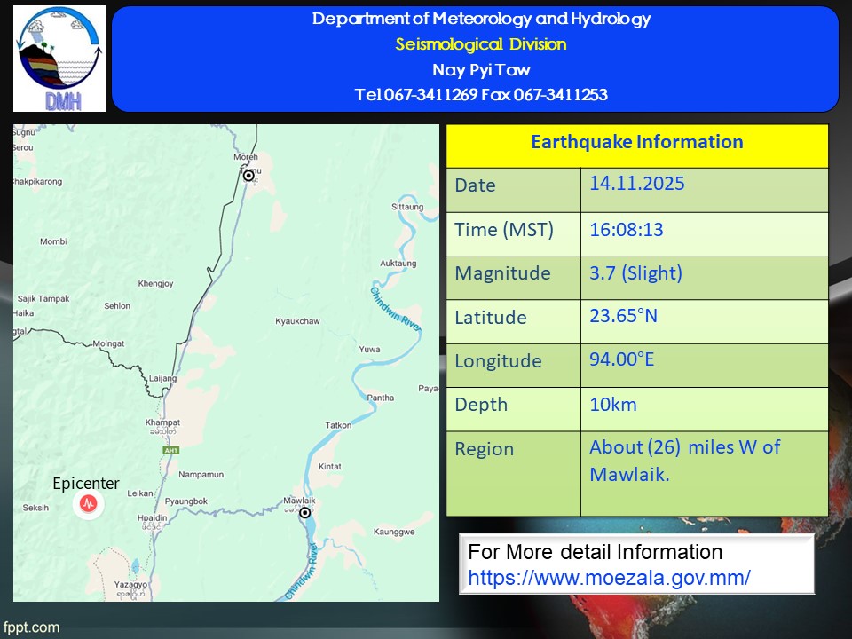 A slight earthquake of magnitude (3.7) Richter Scale with its epicenter inside Myanmar (about (26) miles west of Mawlaik), latitude 23.65°N, longitude 94.00°E, depth (10) kilometers, about (44) miles southwest of Tamu seismological observatory was recorded at (16)hr (08)min (13)sec M.S.T on 14th, November 2025.
