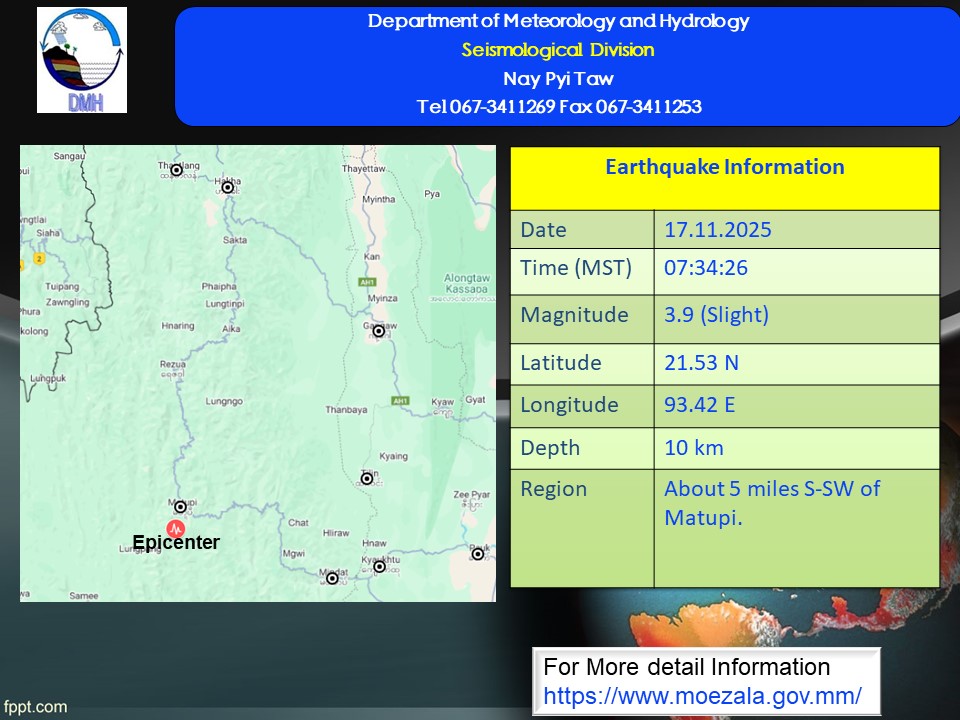 A slight earthquake of magnitude (3.9) Richter Scale with its epicenter inside Myanmar (about (5) miles south-southwest of Matupi), latitude 21.53 °N, longitude 93.42 °E, depth (10) kilometers, about (77) miles south of Hakha seismological observatory was recorded at (07) hr (34) min (26) sec M.S.T on 17th November, 2025.