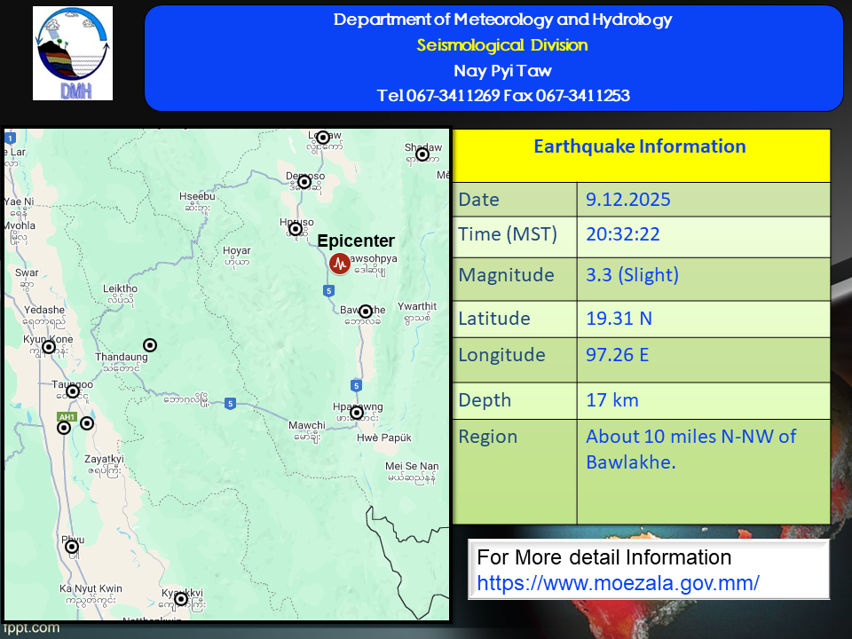 A slight earthquake of magnitude (3.3) Richter Scale with its epicenter inside Myanmar (about (10) miles north-northwest of Bawlakhe), latitude 19.31°N, longitude 97.26°E, depth (17) kilometers, about (59) miles northeast of Taungoo seismological observatory was recorded at (20) hr (32) min (22) sec M.S.T on 9th December, 2025.