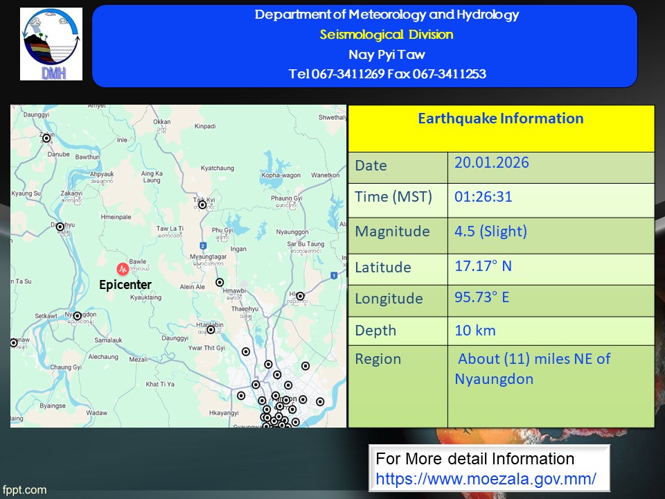 A slight earthquake of magnitude (4.5) Richter Scale with its epicenter inside Myanmar (about (11) miles northeast of Nyaungdon), latitude 17.17°N, longitude 95.73°E, depth (10) kilometers, about (35) miles northwest of Kaba-Aye seismological observatory was recorded at (01)hr (26)min (31)sec M.S.T on 20th January, 2026.