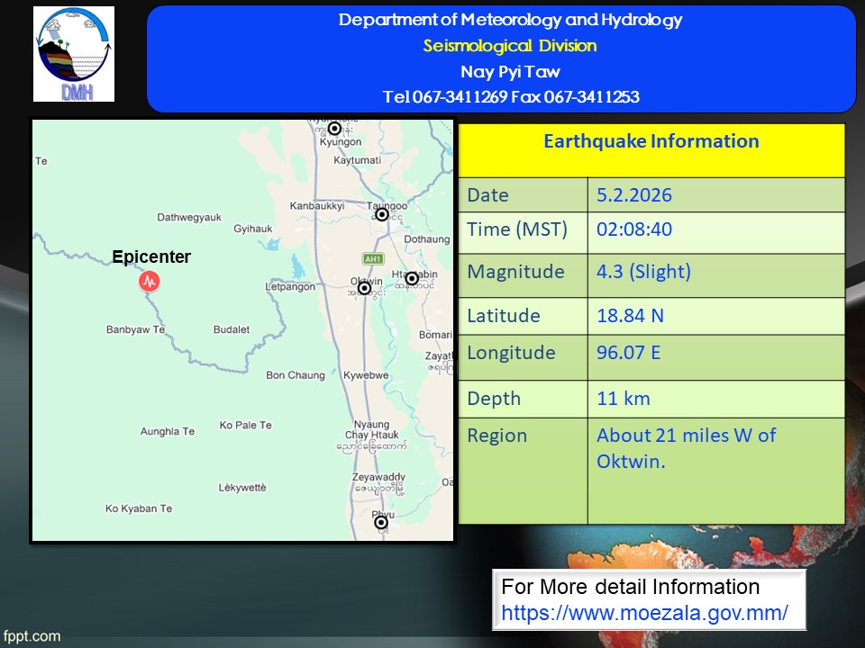 Thursday, February 5, 2026 - 03:15After Shock Earthquake News -274 Date : 5-2-2026 Time : 02:08:40 Magnitude : 4.3 Richter Scale Depth : 11 km Location : about (21) miles west of Oktwin.