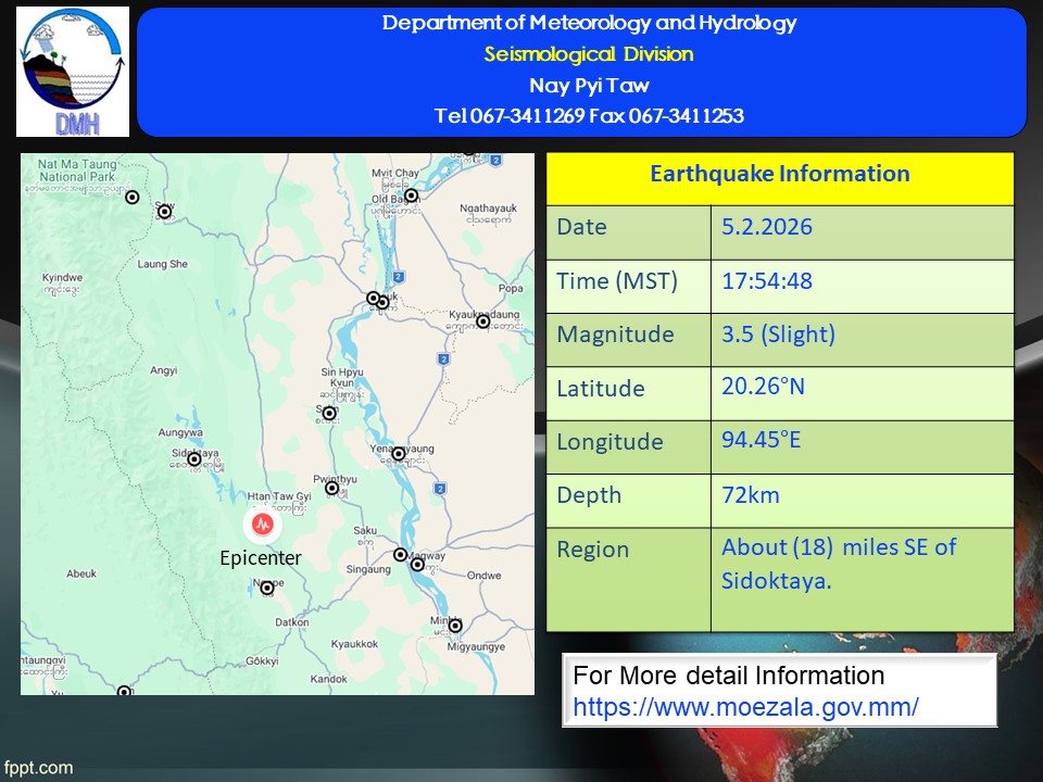 A slight earthquake of magnitude (3.5) Richter Scale with its epicenter inside Myanmar (about (18) miles southeast of Sidoktaya), latitude 20.26°N, longitude 94.45°E, depth (72) kilometers, about (70) miles south-southwest of Nyaung-U seismological observatory was recorded at (17)hr (54)min (48)sec M.S.T on 5th February, 2026.