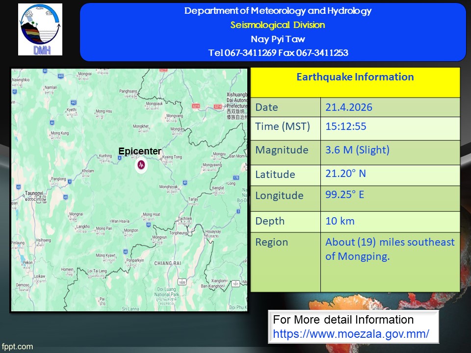 A slight earthquake of magnitude 3.6(M) with its epicenter inside Myanmar, (about (19)miles southeast of Mongping), latitude 21.20°N, longitude 99.25°E, depth (10) kilometers, about (23) miles west-southwest of Kyaing Tong seismological observatory was recorded at (15)hr (12)min (55)sec M.S.T on 21st April, 2026.