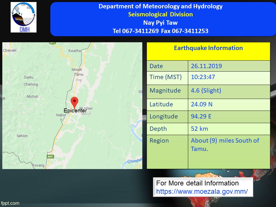 A slight earthquake of magnitude (4.6) Richter Scale with its epicenter Inside Myanmar (about (9) miles south of Tamu), latitude 24.09°N, longitude 94.29°E, depth (52)kilometers, about (8) miles south of Tamu seismological observatory was recorded at (10)hr (23)min (47)sec M.S.T on 26th November, 2019.