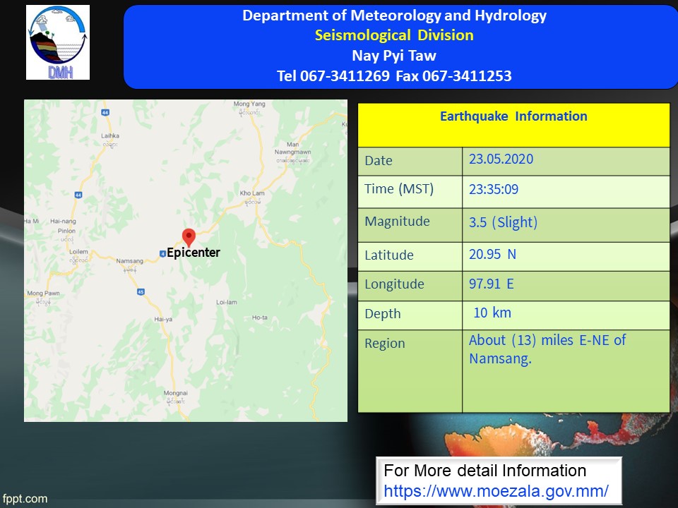 A slight earthquake of magnitude (3.5) Richter Scale with its epicenter inside Myanmar (about (13) miles east-northeast of Namsang), latitude 20.95°N, longitude 97.91°E, depth (10) kilometers, about (10) miles east-northeast of Namsang seismological observatory was recorded at (23)hr (35)min (09)sec M.S.T on 23rd May, 2020.