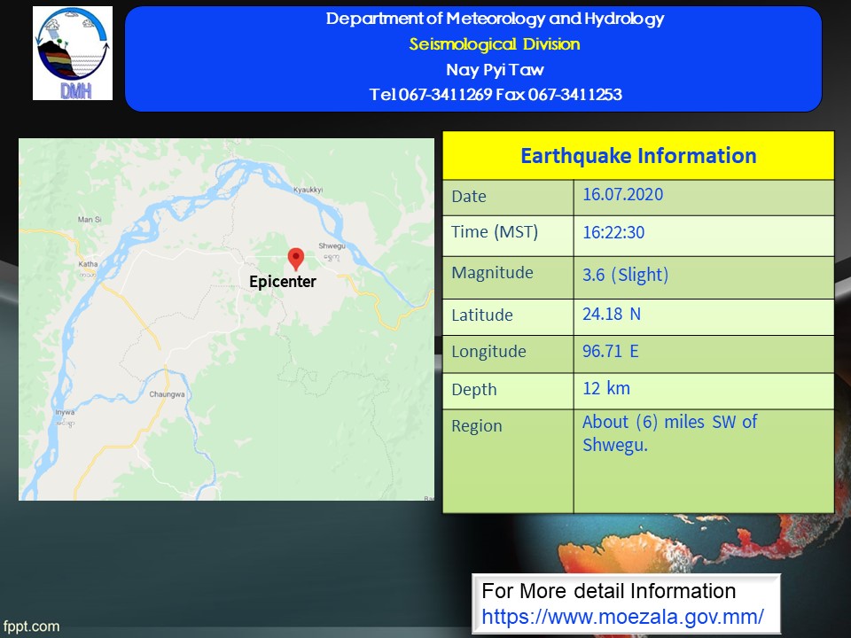 A slight earthquake of magnitude (3.6) Richter Scale with its epicenter inside Myanmar (about (6) miles southwest of Shwegu), latitude 24.18°N, longitude 96.71°E, depth (12) kilometers, about (23) miles east of Katha seismological observatory was recorded at (16)hr (22)min (30)sec M.S.T on 16th July, 2020.