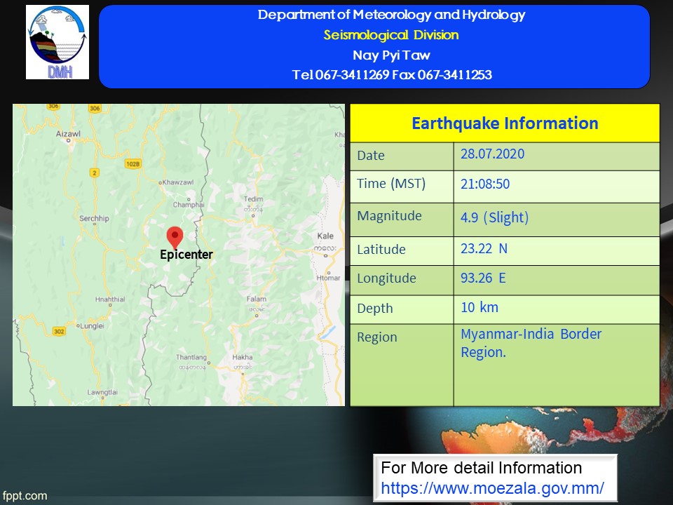 A slight earthquake of magnitude (4.9) Richter Scale with its epicenter outside Myanmar (Myanmar-India Border Region), latitude 23.22°N, longitude 93.26°E, depth (10) kilometers, about (46) miles north-northwest of Hakha seismological observatory was recorded at (21)hr (08)min (50)sec M.S.T on 28th July, 2020.