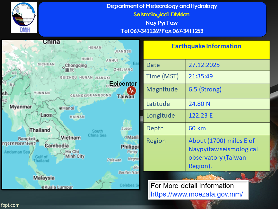A strong earthquake of magnitude (6.5) Richter Scale with its epicenter outside Myanmar (Taiwan Region), latitude 24.80°N, longitude 122.23°E, depth (60) kilometers, about (1700) miles east of Naypyitaw seismological observatory was recorded at (21) hr (35) min (49) sec M.S.T on 27th December, 2025.