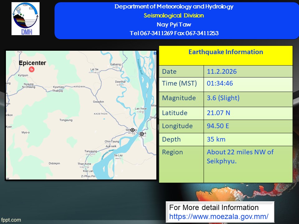 A slight earthquake of magnitude (3.6) Richter Scale with its epicenter inside Myanmar (about (22) miles northwest of Seikphyu), latitude 21.07 °N, longitude 94.50 °E, depth (35) kilometers, about (28) miles west-southwest of Nyaung-U seismological observatory was recorded at (01) hr (34) min (46) sec M.S.T on 11th February, 2026.