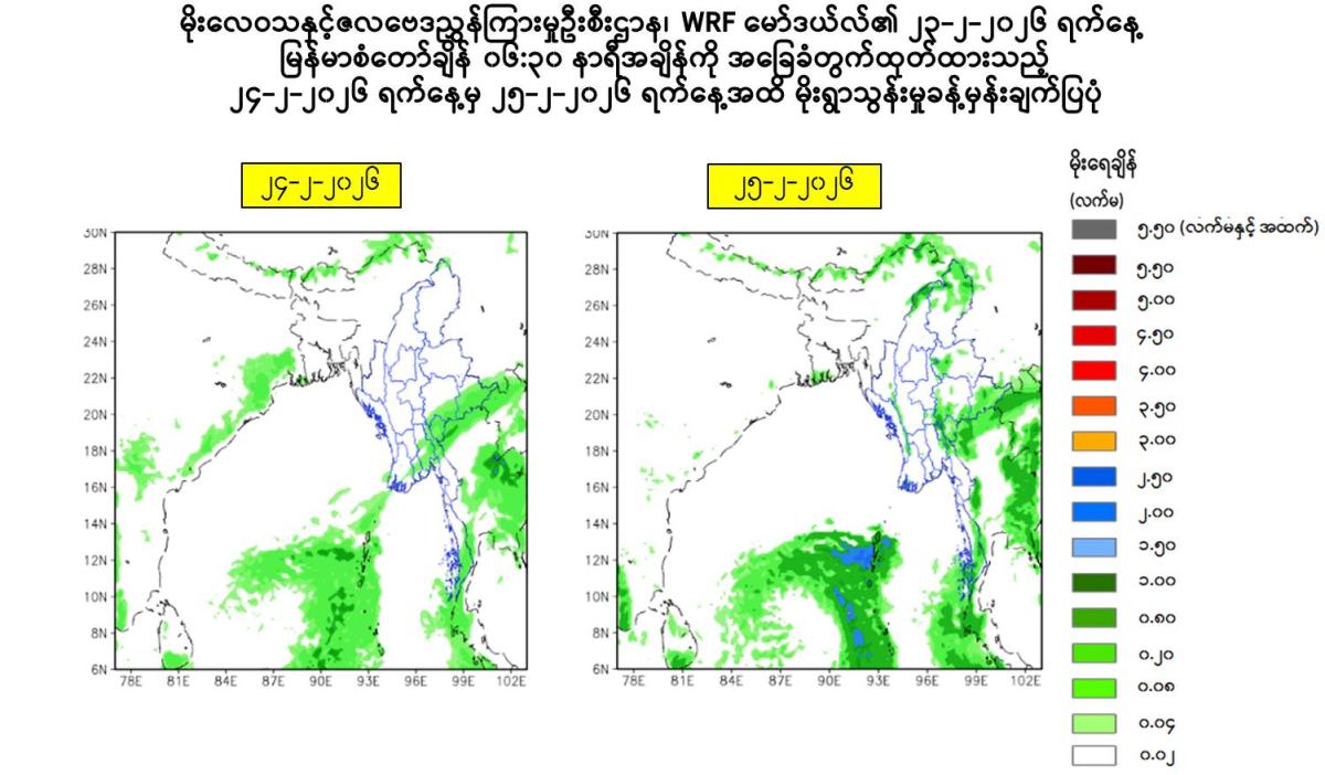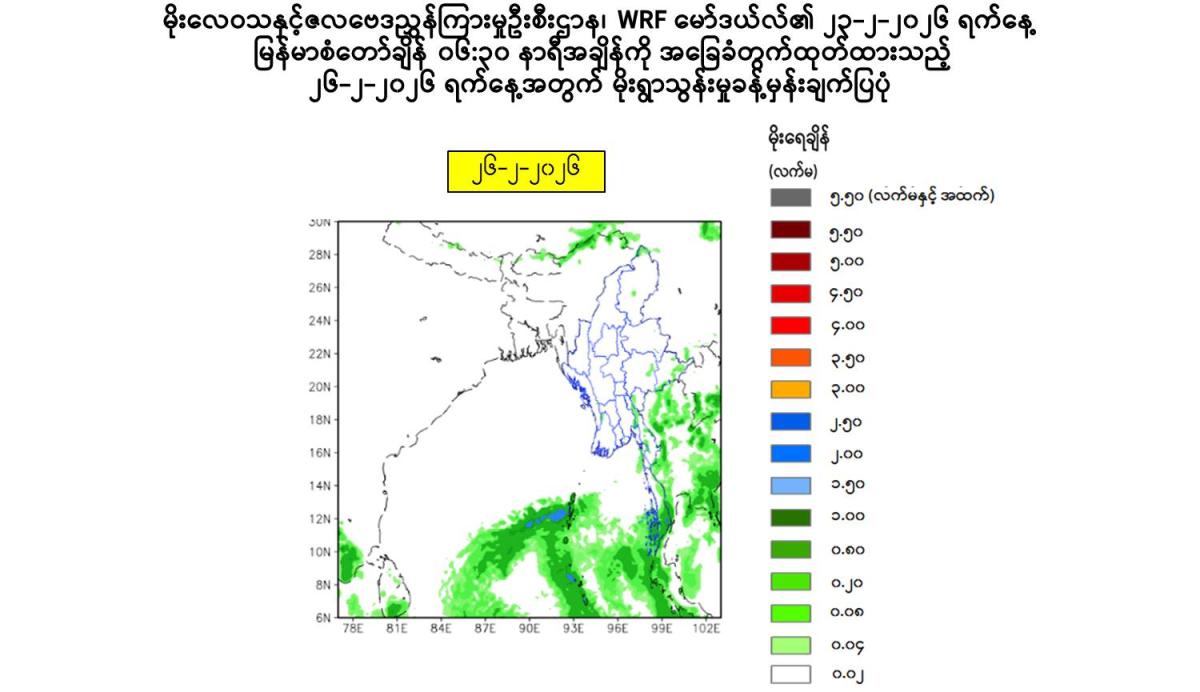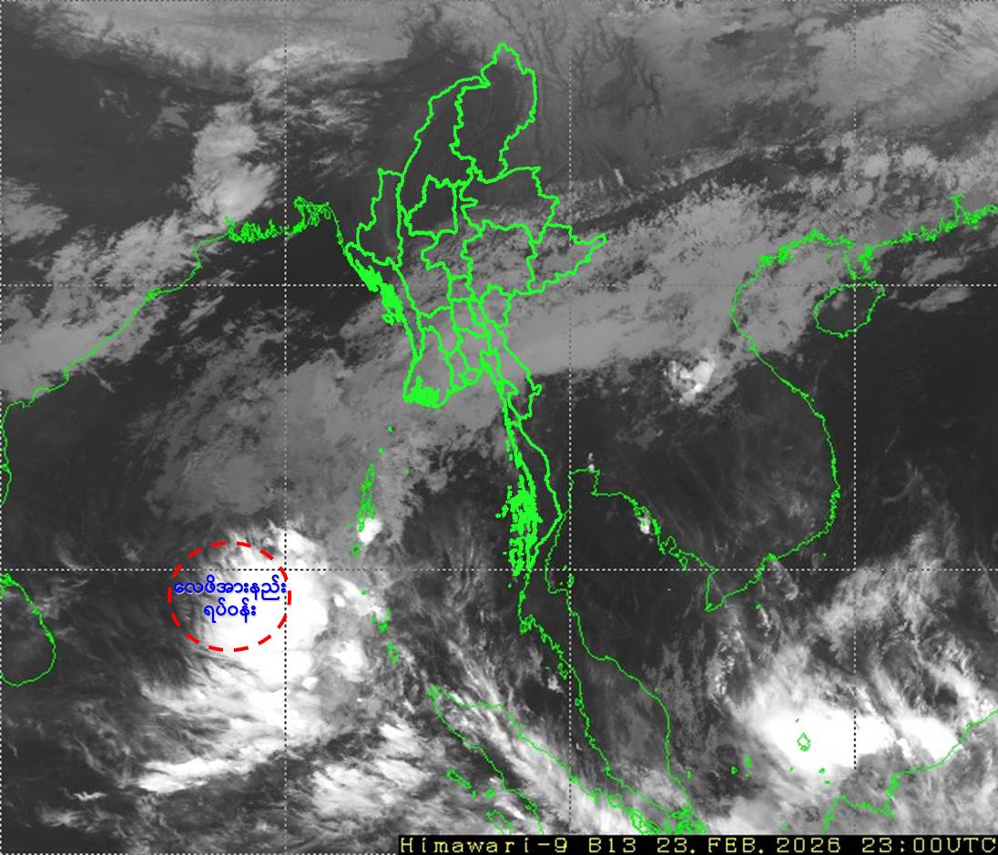 Due to the Low Pressure Area, rain or thundershowers will be isolated to scattered in Naypyitaw, Yangon, Mandalay, Bago, Magway, Ayeyarwady, Taninthayi Regions and Kayah, Kayin, Mon, Rakhine, (Southern and Eastern)Shan States from this morning to 26-2-2026.
