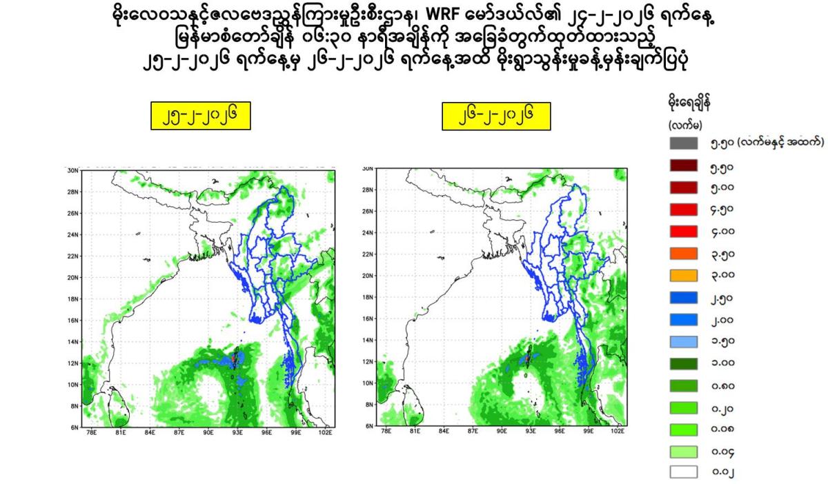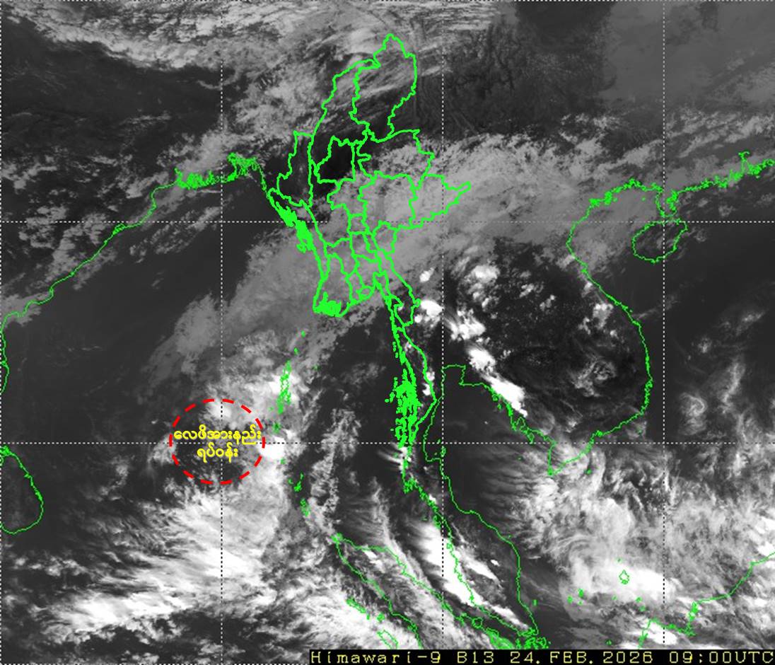 Due to the Low Pressure Area, rain or thundershowers will be isolated to scattered in Naypyitaw, Yangon, Mandalay, Bago, Magway, Ayeyarwady, Taninthayi Regions and Kayah, Kayin, Mon, Rakhine, (Southern and Eastern)Shan States from this evening to 26-2-2026.