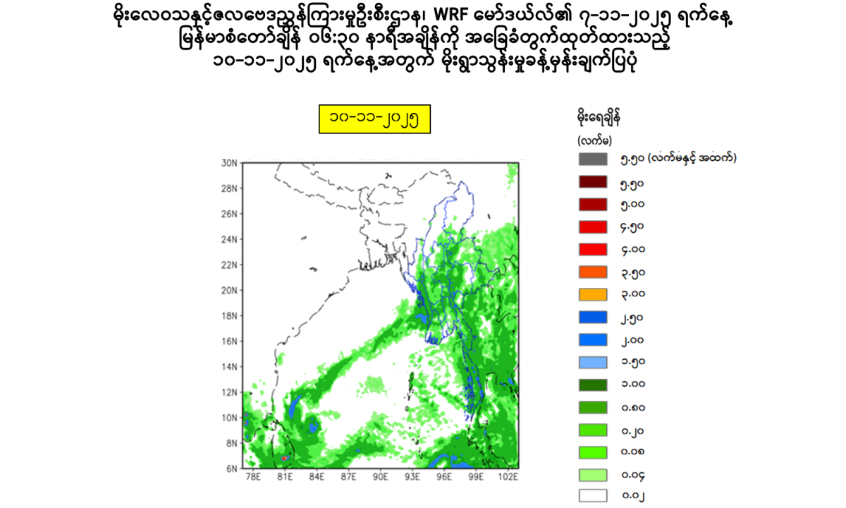 Due to the reminant of cloud from the Low Pressure Area, rain or thundershowers will be fairly widespread to widespread in Naypyitaw, Yangon, Bago, Ayeyarwady, Taninthayi Regions and Kayah, Kayin, Mon, Rakhine, (Southern and Eastern) Shan States with regionally and isolated heavyfalls in some region during today evening to 10-11-2025. Squalls with moderate to rough seas are likely at times in Deltaic, Gulf of Mottama, off and along Mon-Taninthayi Coasts. Surface wind speed in squalls may reach 25-30 mph. Wave height will be about 8-10 feet Deltaic, Gulf of Mottama, Mon-Taninthayi Coasts.