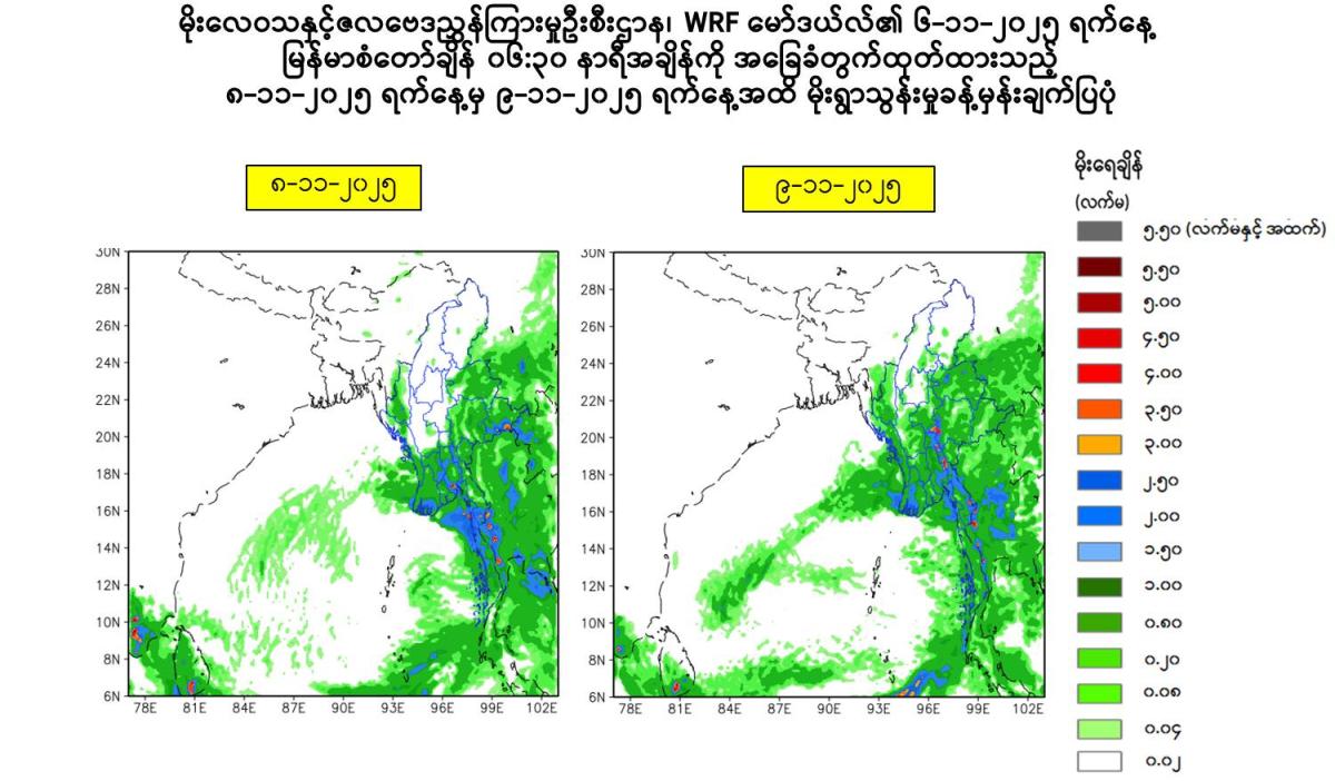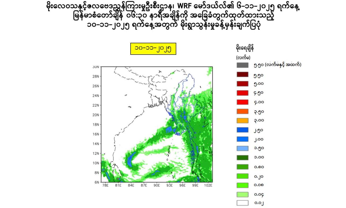 သို့ဖြစ်ပါ၍ မိုးသည်းထန်စွာရွာသွန်းခြင်းနှင့်အတူ လေပြင်းတိုက်ခတ်ခြင်း၊ မိုးထစ်ချုန်းခြင်း၊ မိုးကြိုးပစ်ခြင်း၊ လျှပ်စီးလက်ခြင်း၊ မိုးသီးကြွေခြင်း၊ လျှပ်တစ်ပြက်ရေကြီးခြင်းနှင့် မြေပြိုခြင်းစသည့် သဘာဝဘေးအန္တရာယ်များ ဖြစ်ပေါ်နိုင်ပါသဖြင့် အဆိုပါဒေသများရှိ ကုန်းမြင့်ဒေသအနီးတွင် နေထိုင် ကြသူများအနေဖြင့် မြေပြိုမှုအန္တရာယ်၊ မြစ်ငယ်၊ ချောင်းငယ်များအနီးတွင် နေထိုင်ကြသူများအနေဖြင့် ရေကြီး၊ ရေလျှံမှုများကို ကြိုတင်သတိပြုရှောင်ရှားနိုင်ပါရန်နှင့် ပြည်တွင်းရေကြောင်းသွားလာရေး၊ လေကြောင်းပျံသန်းရေးနှင့် ဆည်မြောင်းတာတမံများအနေဖြင့် လိုအပ်သည်များ ကြိုတင်ပြင်ဆင်ဆောင်ရွက် ထားနိုင်ပါရန် သတိပေးနှိုးဆော်အပ်ပါသည်။