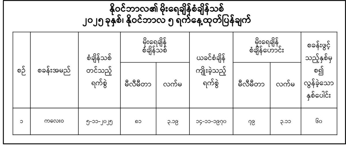 Wednesday, November 5, 2025 - 13:45နိုဝင်ဘာလ၏ မိုးရေချိန်စံချိန်သစ် ၂၀၂၅ ခုနှစ်၊ နိုဝင်ဘာလ ၅ ရက်နေ့ ထုတ်ပြန်ချက် Language Burmese New Records