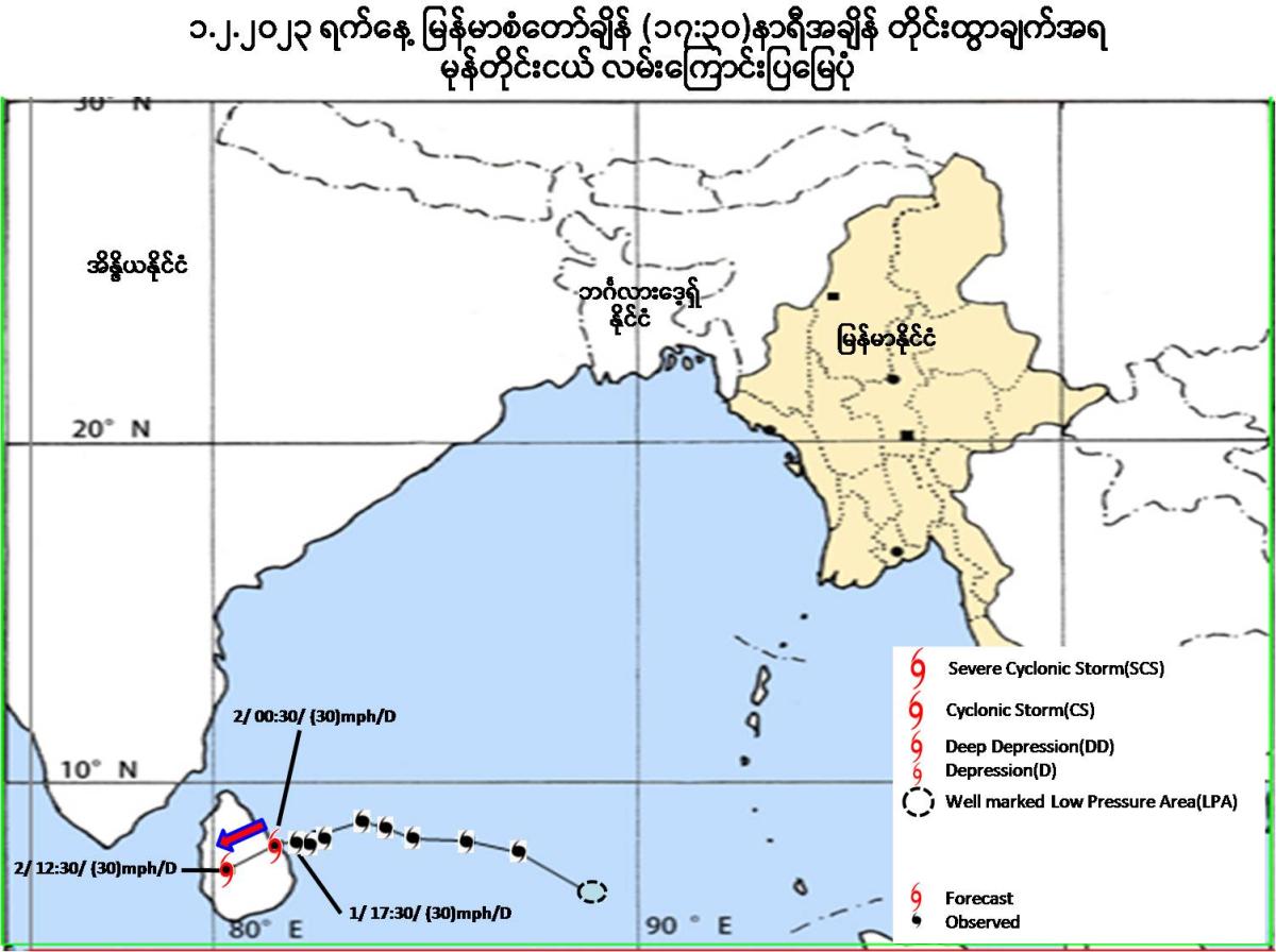 (၁) ယနေ့မြန်မာစံတော်ချိန် (၁၇:၃၀)နာရီအချိန် တိုင်းထွာချက်များအရဘင်္ဂလားပင်လယ်အော်အနောက်တောင်ပိုင်းတွင်ဖြစ်ပေါ်နေသောမုန်တိုင်းငယ်(Depression)သည်သိသိသာသာရွေ့လျားခြင်းမရှိဘဲ၊မြန်မာနိုင်ငံ၊ကိုကိုးကျွန်းမြို့(Coco Island)၏အနောက်တောင်ဘက်ရေမိုင်(၇၆၀)မိုင်ခန့်၊ဟိုင်းကြီးကျွန်းမြို့(Hainggyikyun)၏အနောက်တောင်ဘက်ရေမိုင်(၈၇၀)မိုင်ခန့်၊သီရိလင်္ကာနိုင်ငံ၊ထရီကိုမာလီမြို့(Trincomalee)၏အရှေ့-အရှေ့တောင်ဘက်ရေမိုင် (၆၀)မိုင်ခန့်နှင့်အိန္ဒိယနိုင်ငံ၊ကာရိုင်ကယ်မြို့(Karaikal)၏တောင်-အရှေ့တောင်ဘက်ရေမိုင်(၂၁၅)မိုင်ခန့်အကွာပင်လယ်ပြင်ကိုဗဟိုပြုနေပါသည်။