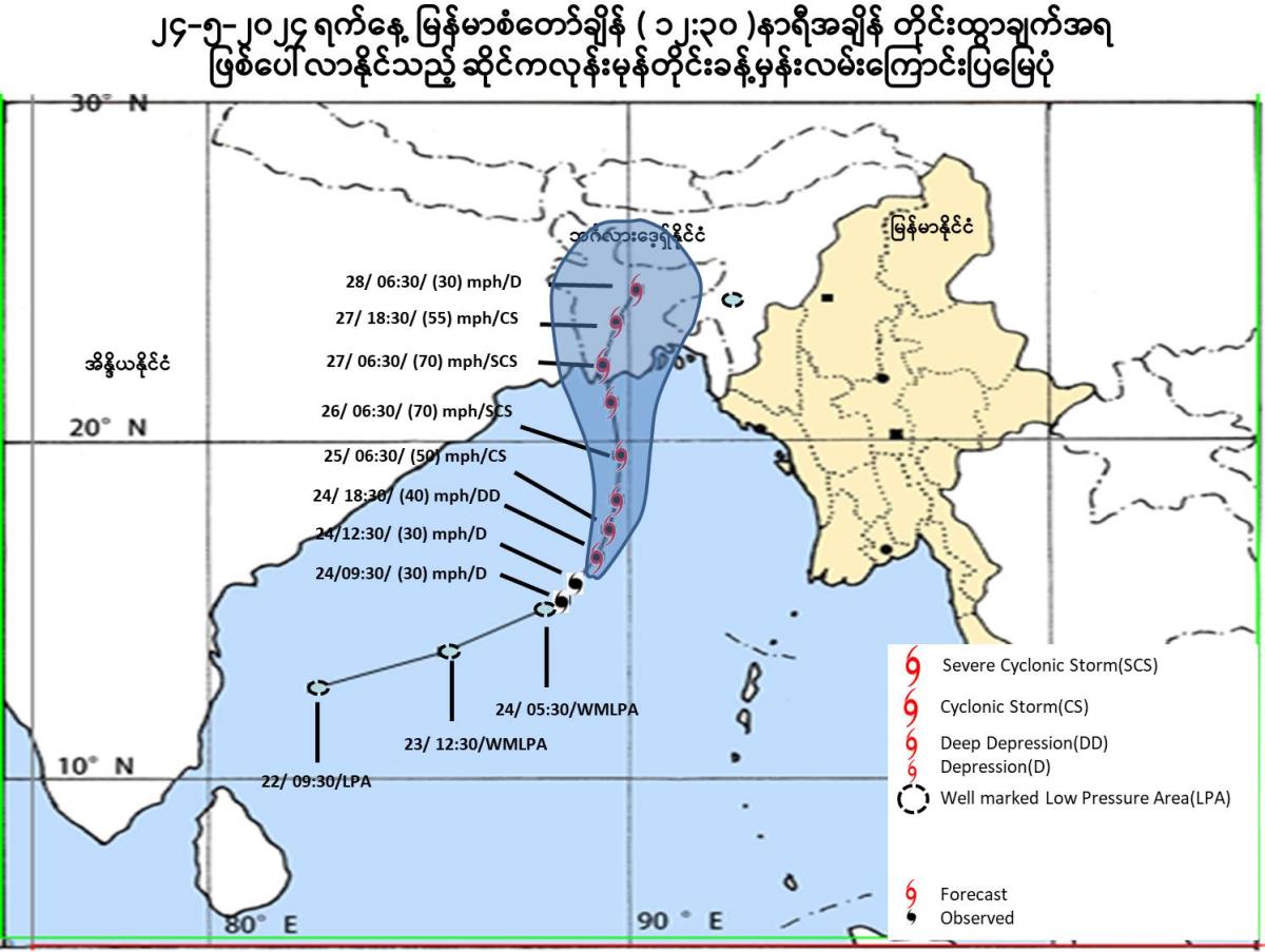 (၁) ယနေ့မြန်မာစံတော်ချိန် (၁၂:၃၀)နာရီအချိန် တိုင်းထွာချက်များအရ ဘင်္ဂလားပင်လယ်အော်အလယ်ပိုင်းတွင် ဖြစ်ပေါ်နေသော မုန်တိုင်းငယ် (Depression)သည် အရှေ့မြောက်ဘက်သို့ ရွေ့လျားခဲ့ပြီး၊ မြန်မာနိုင်ငံ၊ ကိုကိုးကျွန်းမြို့ (Coco Island)၏ အနောက်-အနောက်မြောက်ဘက် ရေမိုင် ၂၈၀ မိုင်ခန့်၊ ဟိုင်းကြီးကျွန်းမြို့(Hainggyigyun)၏ အနောက်-အနောက် တောင်ဘက် ရေမိုင် ၃၃၀ မိုင်ခန့်၊ ဂွမြို့(Gwa)၏ အနောက်-အနောက် တောင်ဘက် ရေမိုင် ၃၇၀ မိုင်ခန့်၊ သံတွဲမြို့(Thandwe)၏ အနောက်-အနောက်တောင်ဘက် ရေမိုင် ၃၇၅ မိုင်ခန့်၊ ဘင်္ဂလားဒေ့ရှ်နိုင်ငံ၊ ခီပူပါရာမြို့ (Khepupara)၏ တောင်-အနောက်တောင်ဘက် ရေမိုင် ၄၀၀ မိုင်ခန့်၊ အိန္ဒိယ နိုင်ငံ၊ အနောက်ဘင်္ဂလားပြည်နယ်၊ ကန်နင်းမြို့(Canning)၏ တောင်ဘက် ရေမိုင် ၄၁၀ မိုင်ခန့်အကွာ ပင်လယ်ပြင်ကို ဗဟိုပြုနေပါသည်။