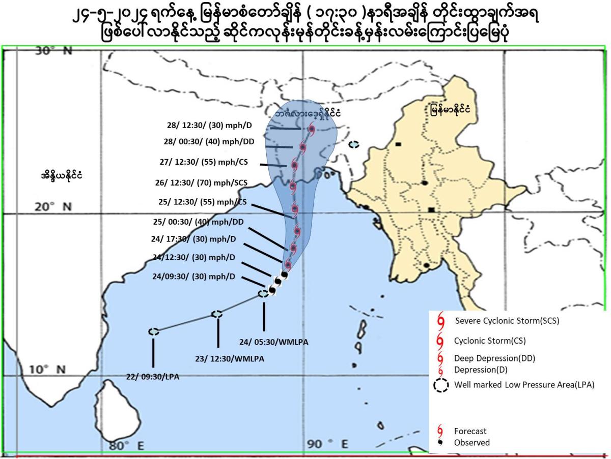 (၁) ယနေ့မြန်မာစံတော်ချိန် (၁၇:၃၀)နာရီအချိန် တိုင်းထွာချက်များအရ ဘင်္ဂလား ပင်လယ်အော်အလယ်ပိုင်းတွင် ဖြစ်ပေါ်နေသော မုန်တိုင်းငယ်(Depression) သည် မြောက်-အရှေ့မြောက်ဘက်သို့ ရွေ့လျားခဲ့ပြီး၊ ဘင်္ဂလားပင်လယ်အော် အရှေ့အလယ်ပိုင်းသို့ ရောက်ရှိခဲ့ကာ၊ မြန်မာနိုင်ငံ၊ ကိုကိုးကျွန်းမြို့(Coco Island) ၏ အနောက်-အနောက်မြောက်ဘက် ရေမိုင် ၂၇၅ မိုင်ခန့်၊ ဟိုင်းကြီးကျွန်း မြို့(Hainggyigyun)၏ အနောက်ဘက် ရေမိုင် ၃၁၀ မိုင်ခန့်၊ သံတွဲမြို့ (Thandwe)၏ အနောက်-အနောက်တောင်ဘက် ရေမိုင် ၃၄၀ မိုင်ခန့်၊ ဘင်္ဂလားဒေ့ရှ်နိုင်ငံ၊ ခီပူပါရာမြို့(Khepupara)၏ တောင်-အနောက်တောင် ဘက် ရေမိုင် ၃၇၀ မိုင်ခန့်၊ အိန္ဒိယနိုင်ငံ၊ အနောက်ဘင်္ဂလားပြည်နယ်၊ ဆာဂါ ကျွန်း(Sagar Island)၏ တောင်-အရှေ့တောင်ဘက် ရေမိုင် ၃၅၀ မိုင်ခန့် နှင့် ကန်နင်းမြို့(Canning)၏ တောင်ဘက် ရေမိုင် ၃၈၀ မိုင်ခန့်အကွာ ပင်လယ်ပြင် ကို ဗဟိုပြုနေပါသည်။