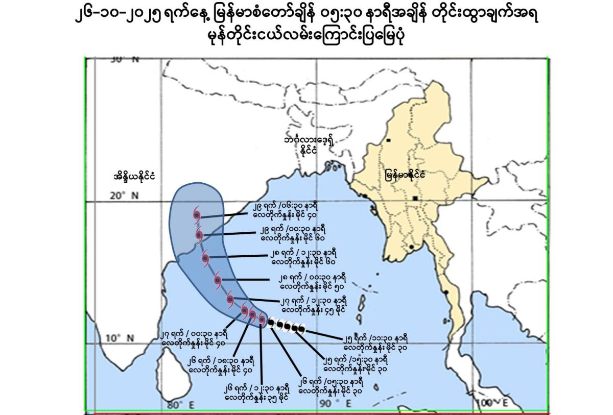 (၁) ယနေ့မြန်မာစံတော်ချိန် ၀၅:၃၀ နာရီအချိန် တိုင်းထွာချက်များအရ ဘင်္ဂလား ပင်လယ်အော်အရှေ့တောင်ပိုင်းတွင် ဖြစ်ပေါ်နေသော မုန်တိုင်းငယ် (Depression) သည် ဆက်လက်တည်ရှိနေပါသည်။ အဆိုပါ မုန်တိုင်းငယ်သည် မြန်မာနိုင်ငံ၊ ကိုကိုးကျွန်းမြို့ (Coco Island) ၏ အနောက်တောင်ဘက် ရေမိုင် ၄၀၀ မိုင်ခန့်၊ အိန္ဒိယနိုင်ငံ၊ ချင်းနိုင်မြို့ (Chennai) ၏ အရှေ့-အရှေ့တောင်ဘက် ရေမိုင် ၄၃၀ မိုင်ခန့်၊ ကာကီနာဒါမြို့ (Kakinada) ၏ အရှေ့တောင်ဘက် ရေမိုင် ၄၆၀ မိုင်ခန့်အကွာ ပင်လယ်ပြင်ကို ဗဟိုပြုနေပါသည်။
