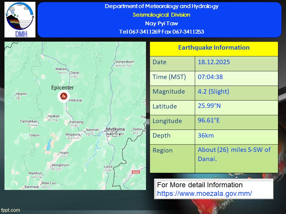 ၂၀၂၅ ခုနှစ်၊ ဒီဇင်ဘာလ ၁၈ ရက်နေ့၊ မြန်မာစံတော်ချိန် (၀၇)နာရီ၊ (၀၄)မိနစ်၊ (၃၈) စက္ကန့် အချိန်တွင် မြစ်ကြီးနားမြေငလျင်စခန်းမှ အနောက်မြောက်ဘက် (၇၅) မိုင်ခန့်ကွာဝေးသော မြန်မာ နိုင်ငံပြည်တွင်း (တနိုင်းမြို့၏ တောင်-အနောက်တောင်ဘက် (၂၆) မိုင်ခန့်အကွာ) မြောက် လတ္တီတွဒ် (၂၅.၉၉) ဒီဂရီ၊ အရှေ့လောင်ဂျီတွဒ် (၉၆.၆၁) ဒီဂရီ၊ အနက် (၃၆) ကီလိုမီတာကို ဗဟိုပြု၍ အင်အားရစ်(ခ်)တာစကေး (၄.၂) အဆင့်ရှိ အင်အားအနည်းငယ်ရှိသော မြေငလျင်တစ်ခု လှုပ်ရှားသွားကြောင်း တိုင်းထွာရရှိပါသည်။