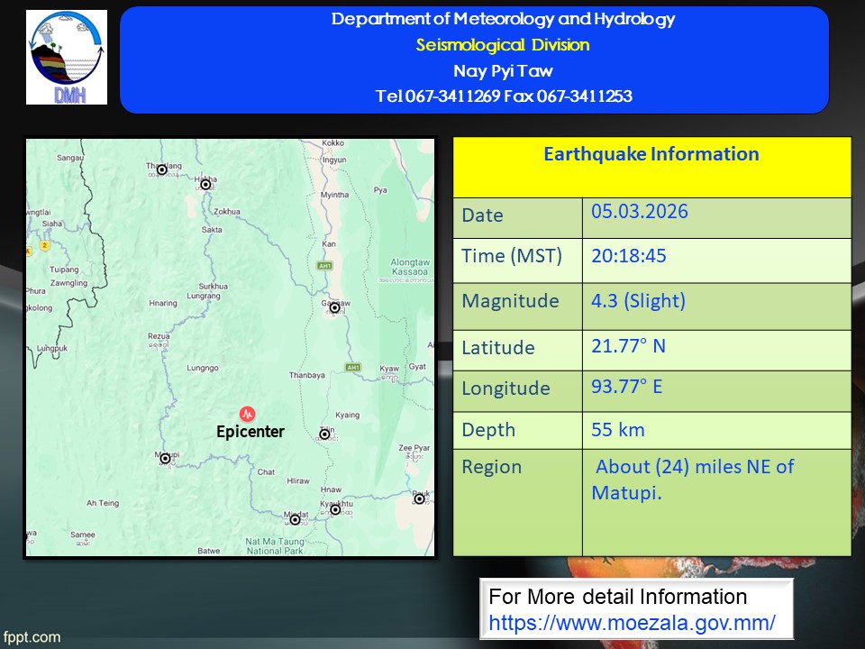 ၂၀၂၆ ခုနှစ်၊ မတ်လ ၅ ရက်နေ့၊ မြန်မာစံတော်ချိန် (၂၀) နာရီ၊ (၁၈) မိနစ်၊ (၄၅) စက္ကန့် အချိန်တွင် ဟားခါးမြေငလျင်စခန်းမှ တောင်-အရှေ့တောင်ဘက် (၆၁) မိုင်ခန့်ကွာဝေးသော မြန်မာနိုင်ငံ ပြည်တွင်း (မတူပီမြို့၏ အရှေ့မြောက်ဘက် (၂၄) မိုင်ခန့်အကွာ)၊ မြောက်လတ္တီတွဒ် (၂၁.၇၇) ဒီဂရီ၊ အရှေ့လောင်ဂျီတွဒ် (၉၃.၇၇) ဒီဂရီ၊ အနက် (၅၅) ကီလိုမီတာကို ဗဟိုပြု၍ အင်အား ရစ်(ခ်)တာစကေး (၄.၃) အဆင့်ရှိ အင်အားအနည်းငယ်ရှိသော မြေငလျင်တစ်ခု လှုပ်ရှား သွားကြောင်း တိုင်းထွာရရှိပါသည်။