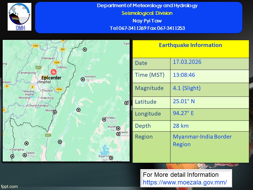 ၂၀၂၆ ခုနှစ်၊ မတ်လ ၁၇ ရက်နေ့၊ မြန်မာစံတော်ချိန် (၁၃)နာရီ၊ (၀၈)မိနစ်၊ (၄၆)စက္ကန့် အချိန်တွင် တမူးမြေငလျင်စခန်းမှ မြောက်ဘက် (၅၄) မိုင်ခန့်ကွာဝေးသော မြန်မာနိုင်ငံ ပြည်ပ (Myanmar-India Border Region)၊ မြောက်လတ္တီတွဒ် (၂၅.၀၁) ဒီဂရီ၊ အရှေ့လောင်ဂျီတွဒ် (၉၄.၂၇) ဒီဂရီ၊ အနက် (၂၈) ကီလိုမီတာကို ဗဟိုပြု၍ အင်အားပမာဏ (၄.၁) အဆင့်ရှိ အင်အားအနည်းငယ်ရှိသော မြေငလျင်တစ်ခု လှုပ်ရှားသွားကြောင်း တိုင်းထွာရရှိပါသည်။