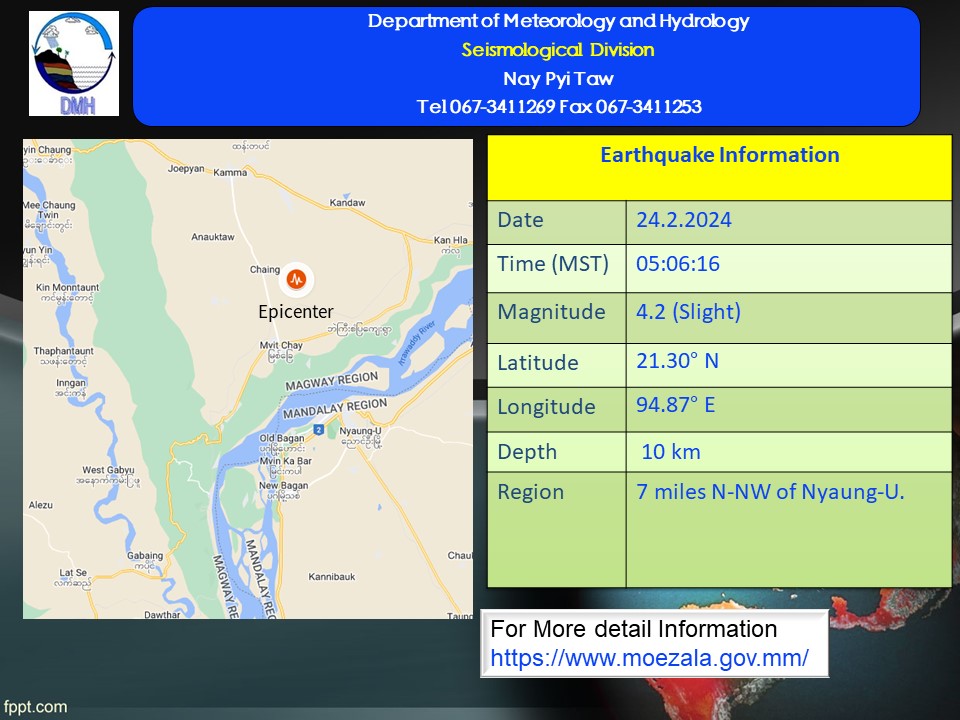 ၂၀၂၄ ခုနှစ်၊ ဖေဖော်ဝါရီလ ၂၄ ရက်နေ့၊ မြန်မာစံတော်ချိန် (၀၅) နာရီ၊ (၀၆) မိနစ်၊ (၁၆) စက္ကန့် အချိန်တွင် ညောင်ဦးမြေငလျင်စခန်းမှ မြောက်-အနောက်မြောက်ဘက် (၇) မိုင်ခန့်အကွာ၊ မြန်မာနိုင်ငံ ပြည်တွင်း (ညောင်ဦးမြို့၏ မြောက်-အနောက်မြောက်ဘက် (၇) မိုင်ခန့်ကွာ) မြောက်လတ္တီတွဒ် (၂၁.၃၀) ဒီဂရီ၊ အရှေ့လောင်ဂျီတွဒ် (၉၄.၈၇) ဒီဂရီ၊ အနက် (၁၀) ကီလိုမီတာကို ဗဟိုပြု၍ အင်အားရစ်(ခ်)တာစကေး (၄.၂) အဆင့်ရှိ အင်အားအနည်းငယ်ရှိသော မြေငလျင်တစ်ခု လှုပ်ရှားသွား ကြောင်း တိုင်းထွာရရှိပါသည်။